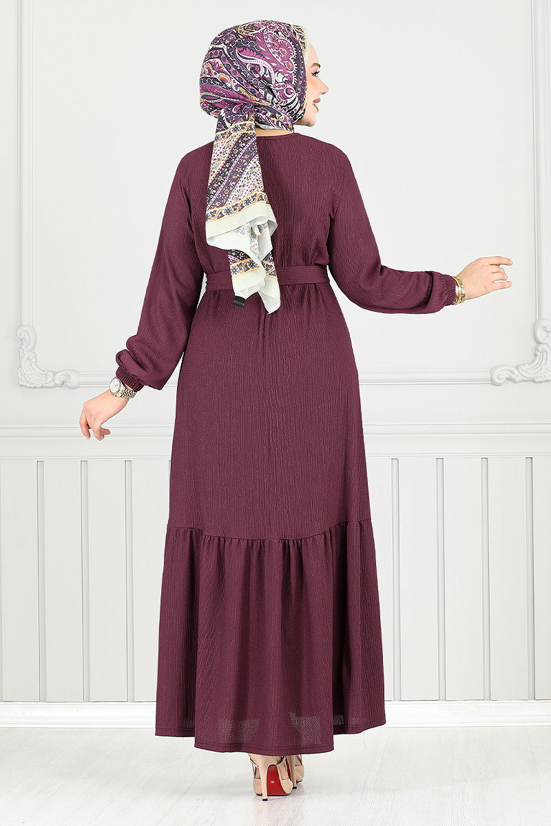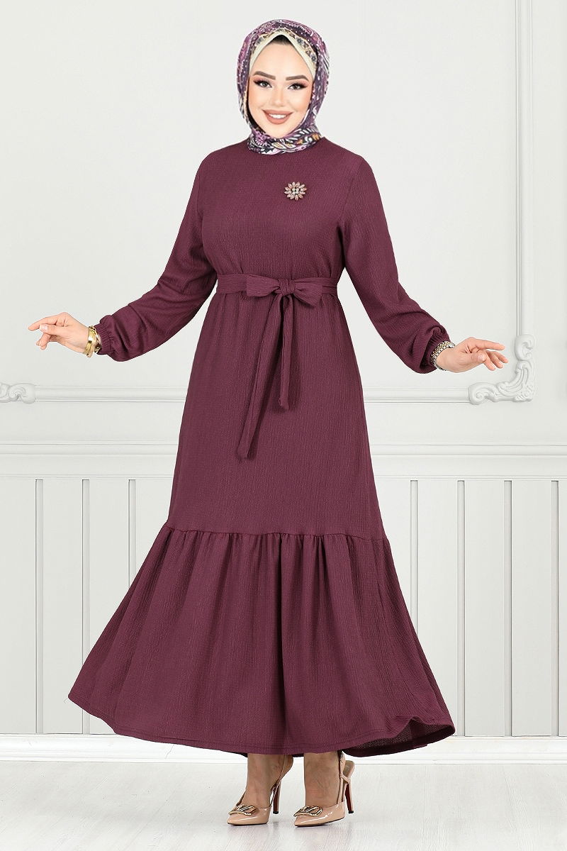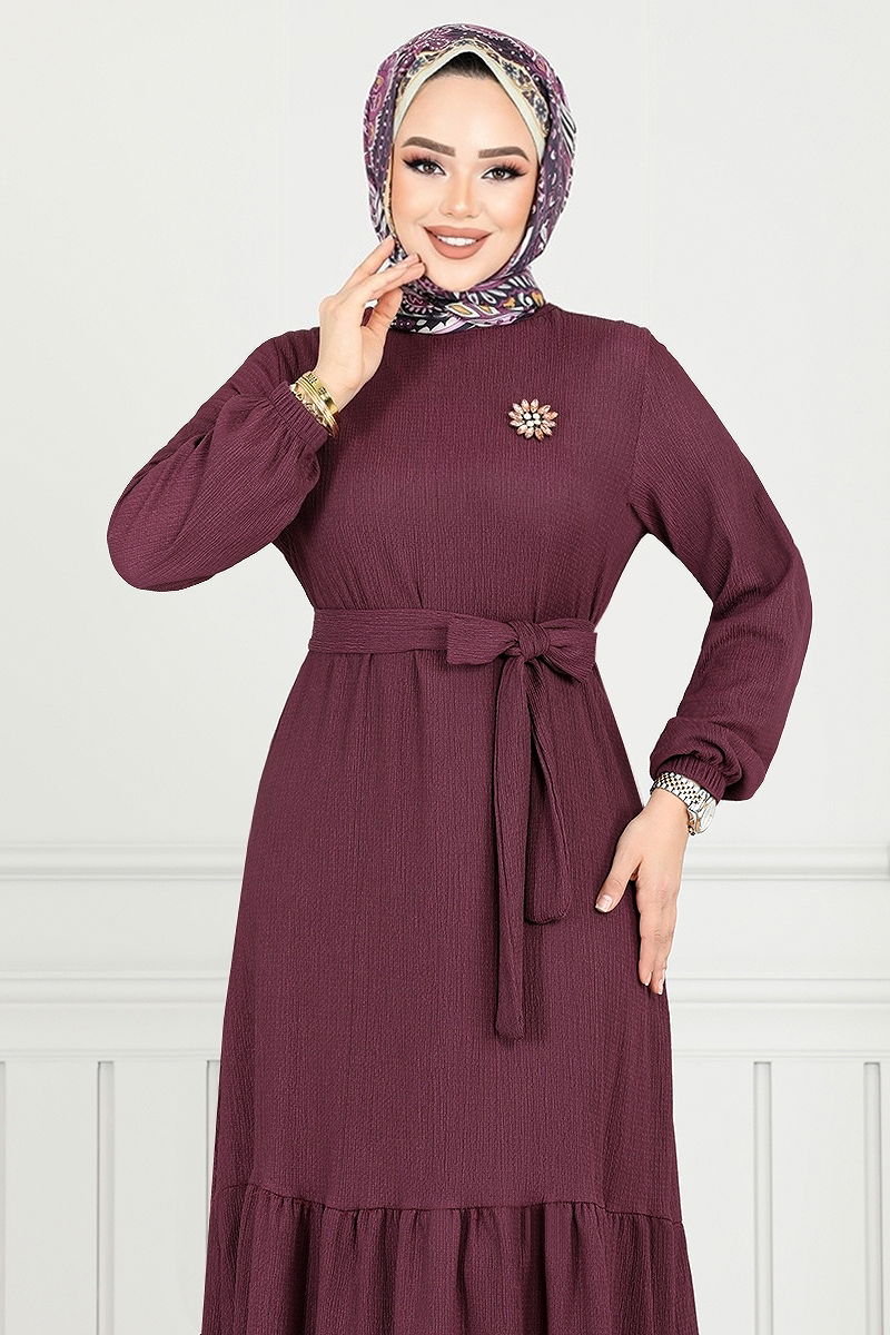 The Elastic Cuff Crinkled Dress is a modest wear model suitable for all seasons. Especially designed for gentle washing at 30 degrees, this dress is made from crinkled fabric, emphasizing its durable structure. It features a bicycle neckline and an unlined design for a modern look. Available in a standard size 38, this dress offers practical wear with its pullover style. It also comes with a specially sewn belt to prevent waviness. Both the belt and the brooch are removable, leaving the choice up to you. Elastic cuffs are designed for comfortable wear.