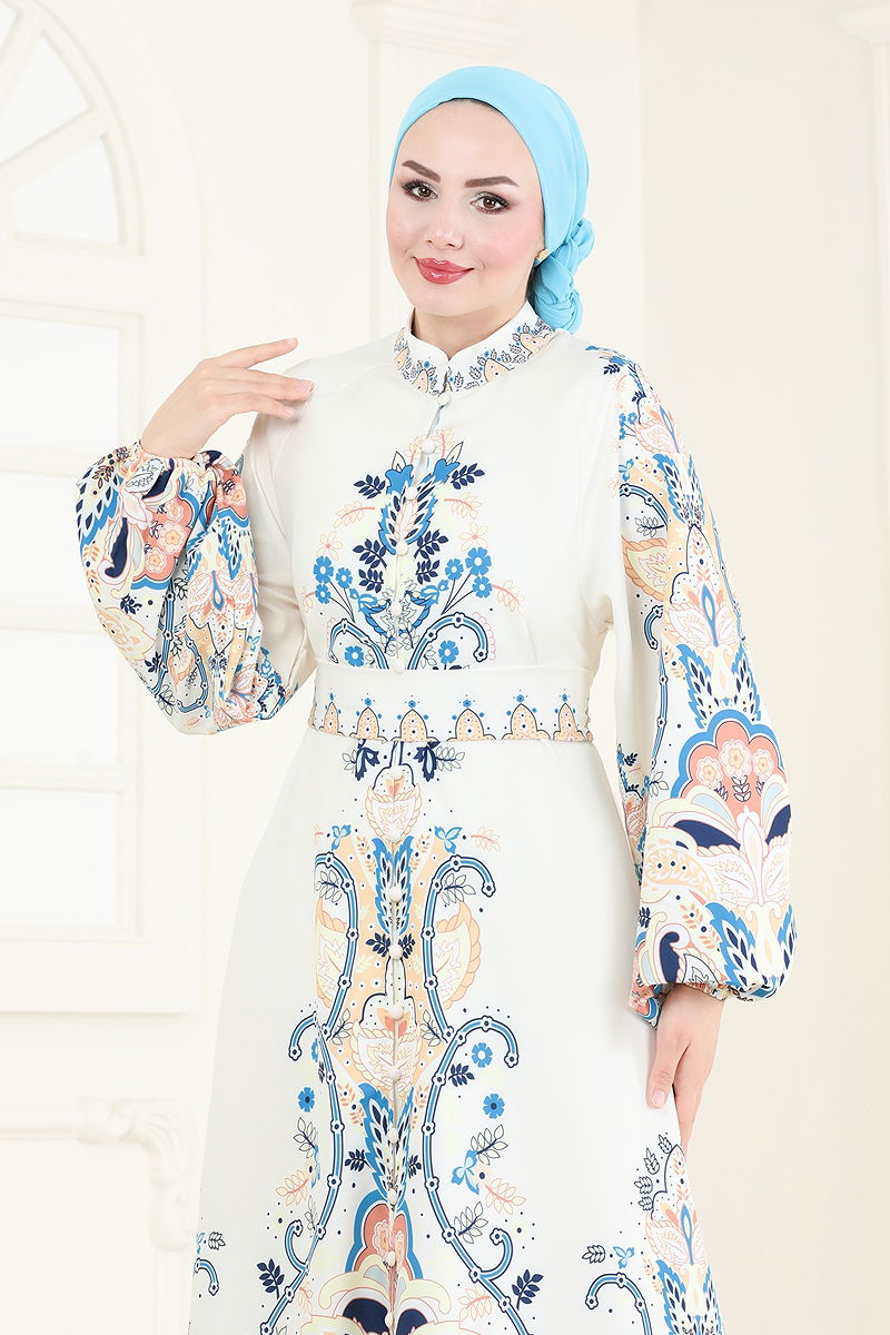 The Patterned Satin Dress is a blend of classic and modern touches, serving as an elegant hijab outfit. Suitable for all seasons, this dress can be washed at 30 degrees on a delicate cycle. Its soft satin fabric, half mandarin collar, and front button details make it stand out. With its unlined design and elastic cuffs, it offers comfort. The included belt, which can be optionally worn, adds a touch of elegance. The product on the model is size 38 and adapts to every style.