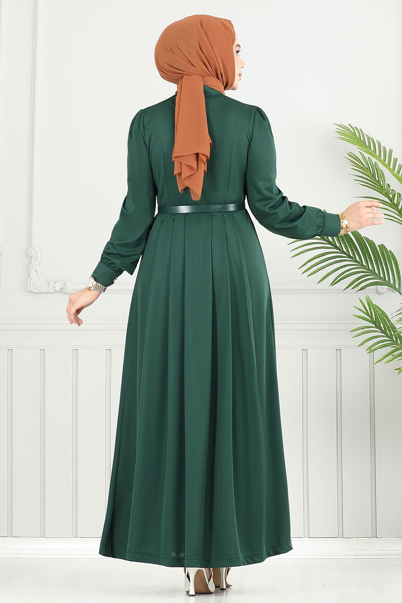 The Pleated Skirt Dabıl Dress is a modest wear model perfect for all seasons. Crafted from special Dabıl knit fabric, it offers a comfortable experience. Washable at 30 degrees with delicate care, this elegant dress features a semi-mandarin collar and front-button detailing for a modern look. Its unlined design, active cuff buttons, and adhesive stone details provide a striking style. The included belt can be optionally used to complete the perfect fit.
