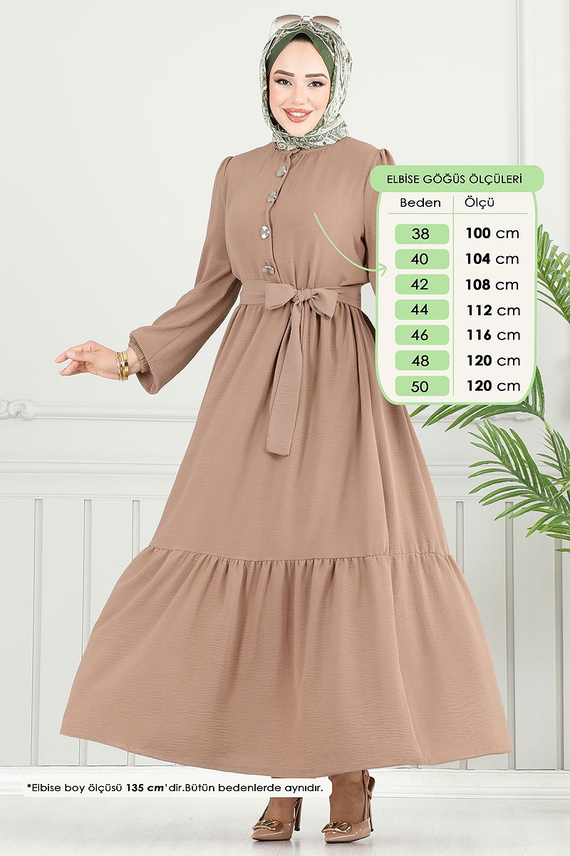 The Half-Buttoned Aerobin Dress is a modest attire made from specialized aerobin fabric, suitable for all seasons. This dress can be washed at 30 degrees on a gentle cycle and features a semi-mandarin collar design with half-front buttons. It is unlined, with a seamed waistline. The belt included with the dress has stitched ends with an unstitched middle, providing adjustable styling options. The cuffs are elasticated, making the dress versatile for daily wear or special occasions. The product displayed is in size 38.