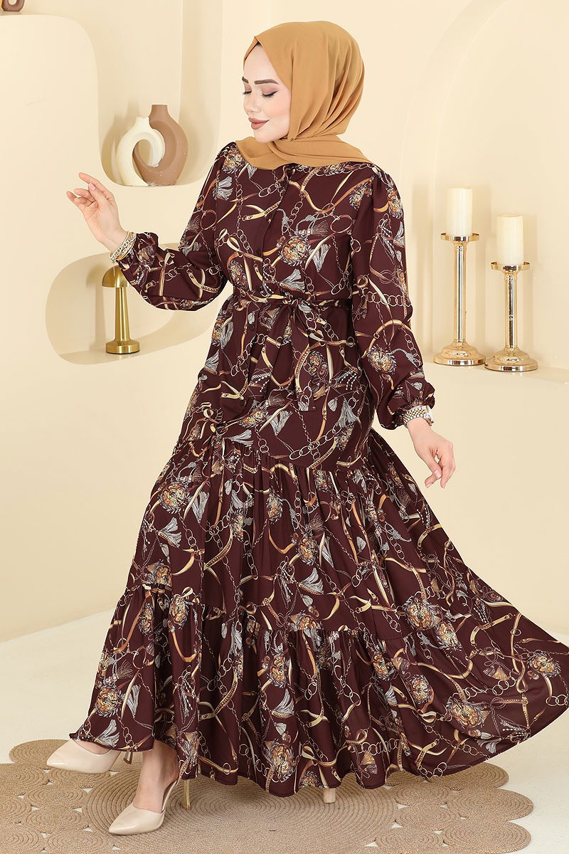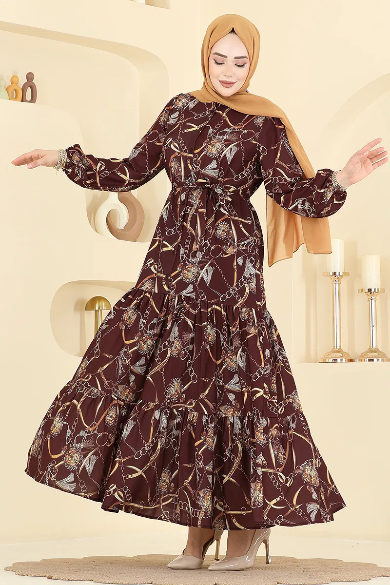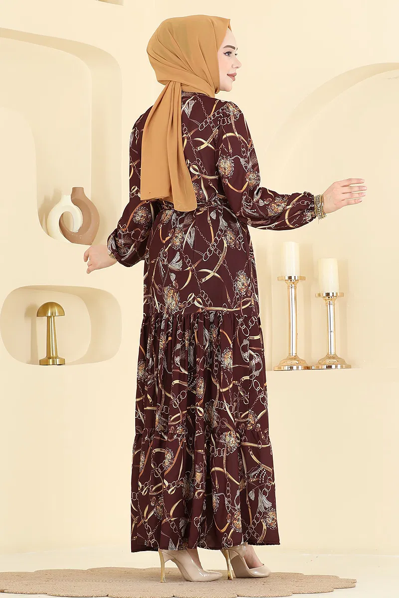 Elevate your elegance with the Chic Chain Pattern Dress, combining comfort and style for all seasons! Made from delicate jesika fabric, this modest dress features a semi-mandarin collar and a buttoned front for easy wear. The frilled hem enhances your mobility, while the elastic cuffs ensure a comfortable fit. The belt is included and optional for use. Washable at 30 degrees on a gentle cycle, this dress is perfect for maintaining your chic look throughout the year.