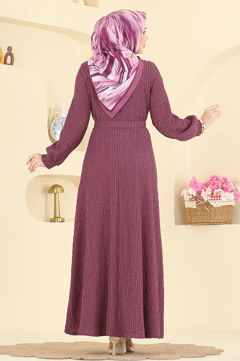 The Belt-Detailed Crinkle Dress offers a unique touch to the modest fashion world. Suitable for all seasons, this dress is easy to care for with its 30-degree delicate wash feature. Made from special crinkle fabric, it provides an eye-catching look. Its crew neck and unlined design offer contemporary elegance, displayed here in size 40. The belt is designed with sewn ends to prevent waving and is presented in harmony with the dress, but can be optionally removed.