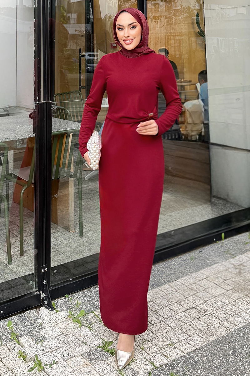 Elegant and chic, the Belt Buckle Detailed Dress is a modest wear suitable for all seasons. Recommended to be washed gently at 30 degrees to ensure longevity. Features a crew neckline and an unlined design for a contemporary look. The size in the displayed model is 38 and there is a practical button at the back.