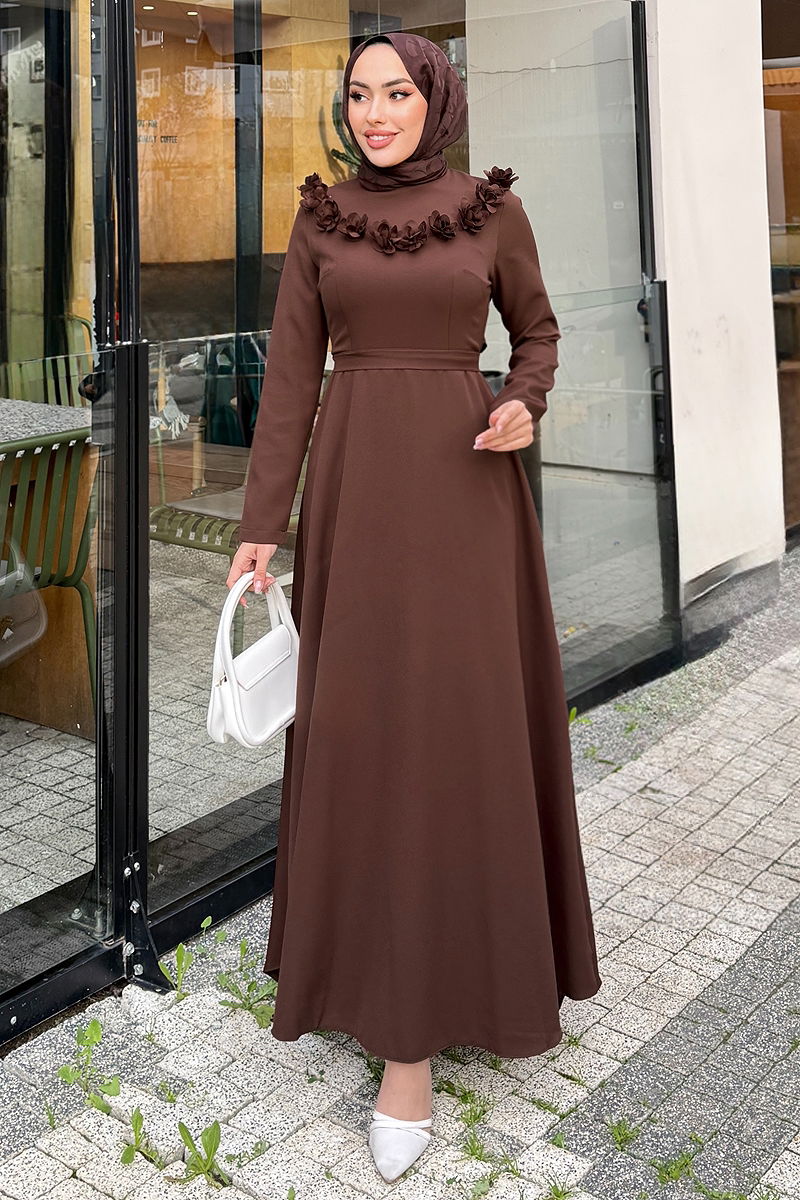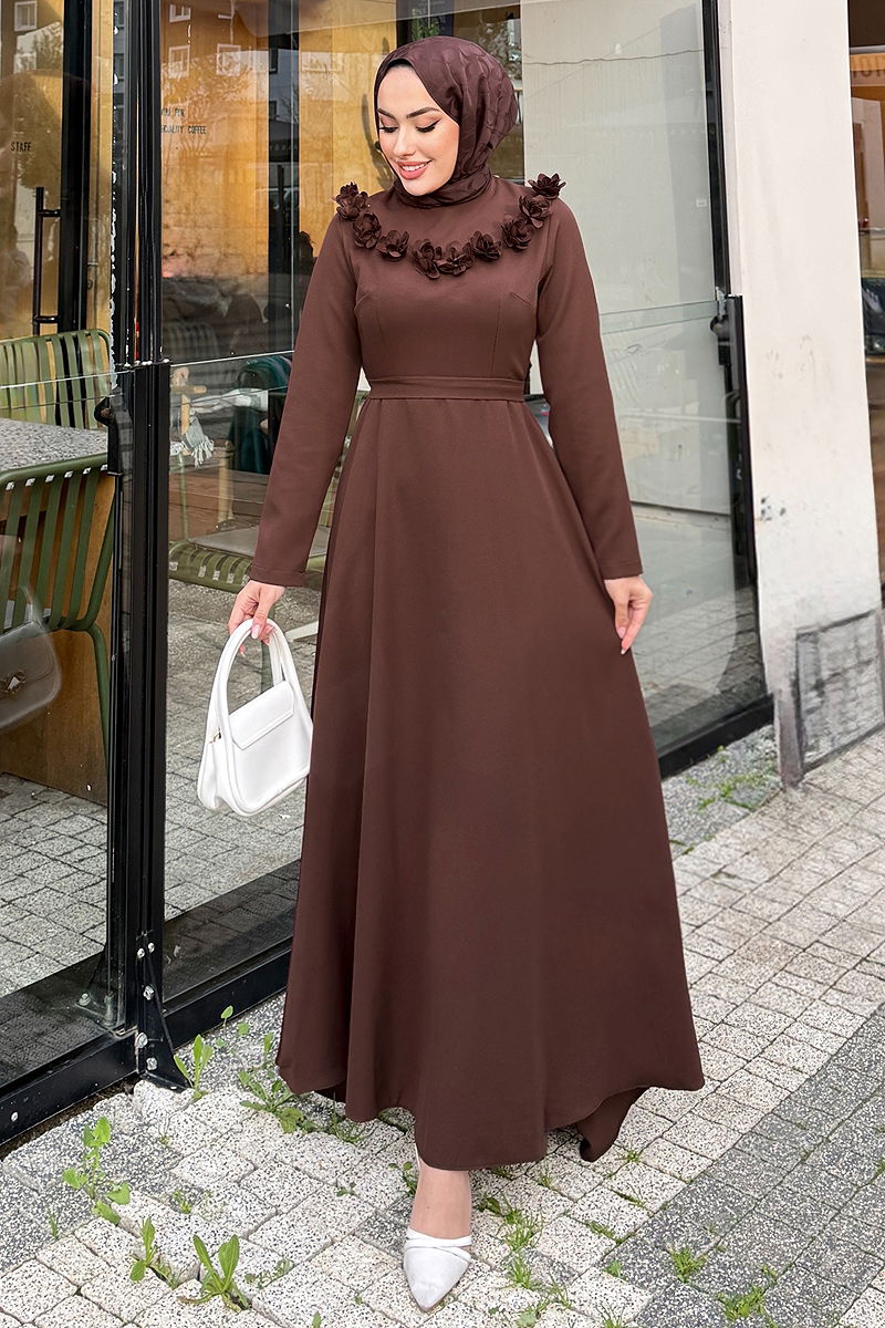 Offering both elegance and comfort, the Stylish Dress with Flower Accessories can be joyfully worn throughout all seasons. Noting its modest design, this dress requires dry cleaning only. It features a semi-high collar and is designed without lining, providing ease with its back zipper. Displayed using a size 38 model, it includes a specifically designed skirt belt to prevent waving, with two ends stitched while leaving the middle part open (seamless), which can optionally be used.