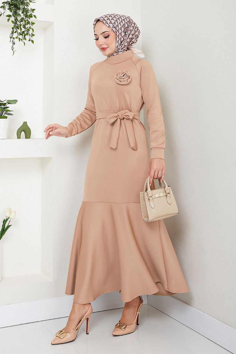 Brooch Detailed Dress. This dress is a hijab model and can be used in all four seasons. It should be washed without squeezing at 30 degrees. It is made of first class satin fabric. The dress has a dominant collar. It is without lining. (The product on the model is size 1.) The inner dress is worn over the head. The two ends of the belt are stitched to prevent waving, and the middle part is left empty (seamless). The belt is included with the product and can be optionally used. The brooch is included with the product and can be optionally used.