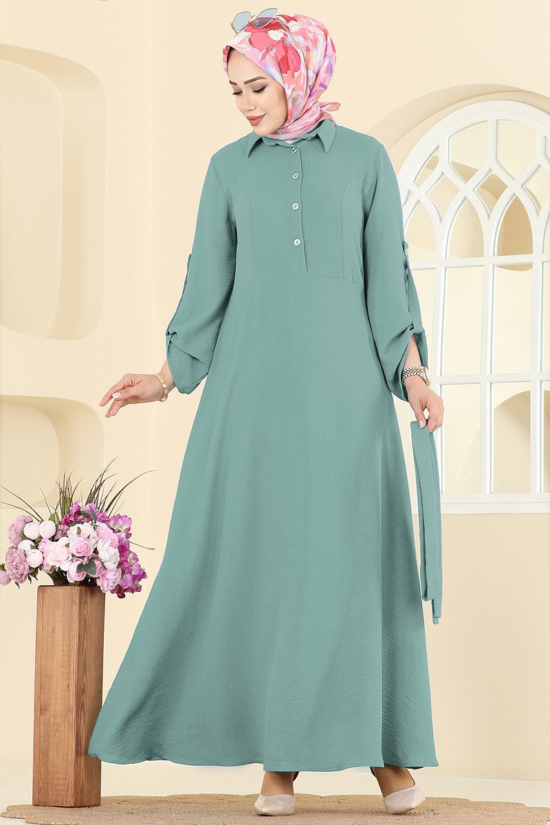 The Epaulette Detailed Aerobin Dress is suitable for those who wear modest clothing. Made from aerobin fabric, this stylish dress can be comfortably worn in all seasons. Its delicate fabric is washable at 30 degrees and easy to maintain. It offers a modern look with a shirt collar and a half-button front. The unlined design does not show the interior, ensuring comfortable wear. The product has a seamed waist and active epaulette buttons on the cuffs. The belt, designed to prevent waviness, has sewn ends and can be optionally removed. This dress is both stylish and functional.