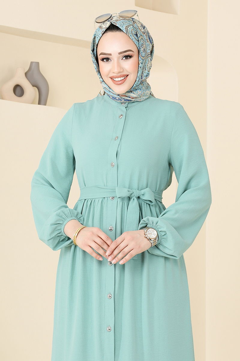 The Layered Skirt Dress is a modest wear model suitable for all seasons. Made from special Aerobin fabric, it can be washed gently at 30 degrees and is durable. It offers a stylish look with a semi-High collar and front button details, ensuring practical use. Its lining-free design makes it lightweight and comfortable. The built-in belt prevents waviness and outlines an elegant silhouette. The belt can be optionally removed. The cuffs are elasticated, providing freedom of movement.