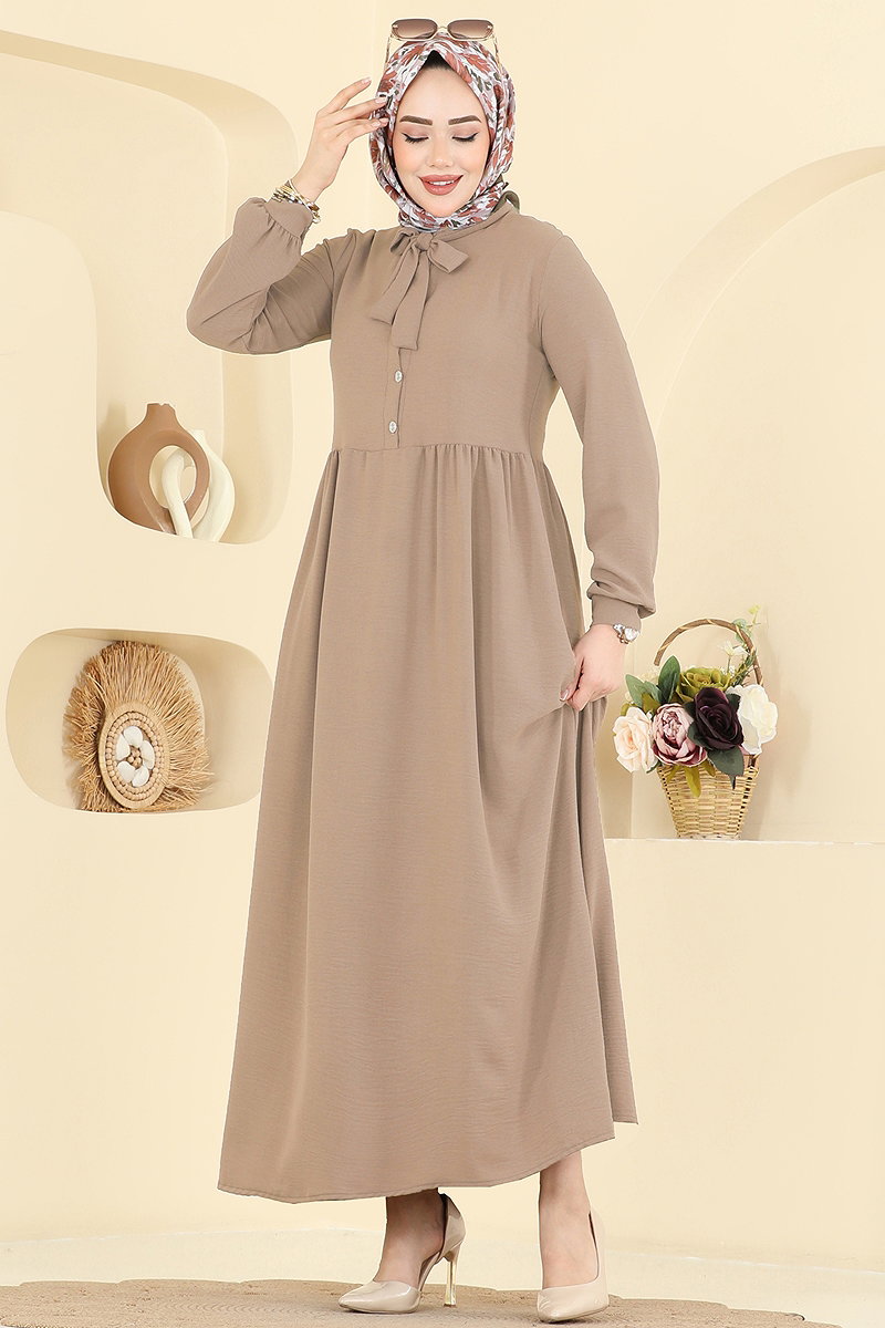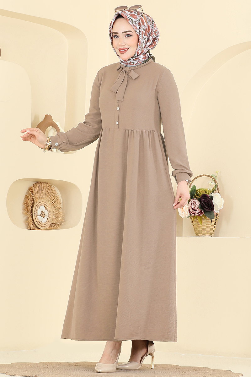 The Drawstring Collar Detail Dress is a stylish and modern design suitable for hijabi fashion. Designed for comfort in all seasons, this special design can be washed at 30 degrees thanks to its delicate nature. Made from aerobin fabric, it features a semi-mandarin collar and button-down front for practical use. Its unlined structure makes it light and comfortable, while active cuff buttons add functionality. This product promises an elegant and respectable look in any setting.