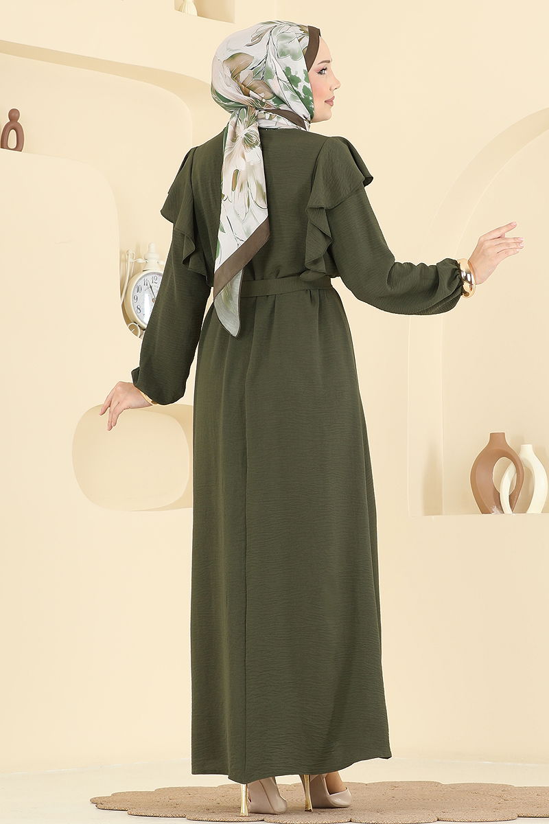 يوجد زر يمكن استخدامه من الخلف. المنتج لديه ياقة دائرية. غير مبطنة. الحزام متضمن، ،يمكن استخدامها حسب الرغبة السوار مطاطي. قد يكون هناك اختلاف في الدرجة اللونية في المنتج بسبب التقاط الصور الفوتوغرافية.