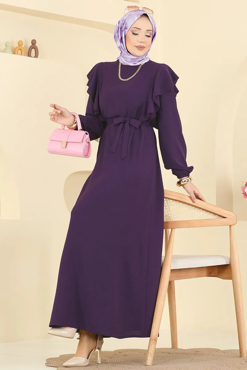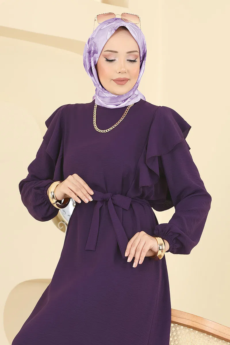 The Ruffled Shoulder Aerobin Dress is a modern and stylish hijab dress suitable for all seasons. It can be washed on a gentle cycle at 30 degrees and features a crew neck without lining for comfort. Displayed on a size 38 model, it includes a practical button at the back. The belt is designed with sewn ends to prevent waving and can be optionally removed. With elasticated cuffs, this dress is ideal for maintaining your elegance in any setting.