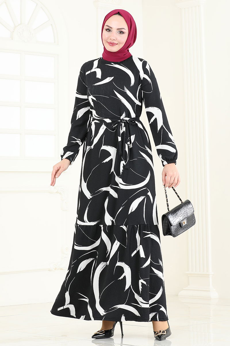 Patterned Ottoman Fabric Dress has been specially designed for those seeking modest fashion. It can easily be worn during Autumn and Winter. Its delicate ottoman fabric stands out with its capability to be washed at 30 degrees. The dress offers a modern look with its bicycle collar and unlined design, and is presented in size M. The belt, designed for ease of use, completes the elegance of the dress with its elasticated cuffs.