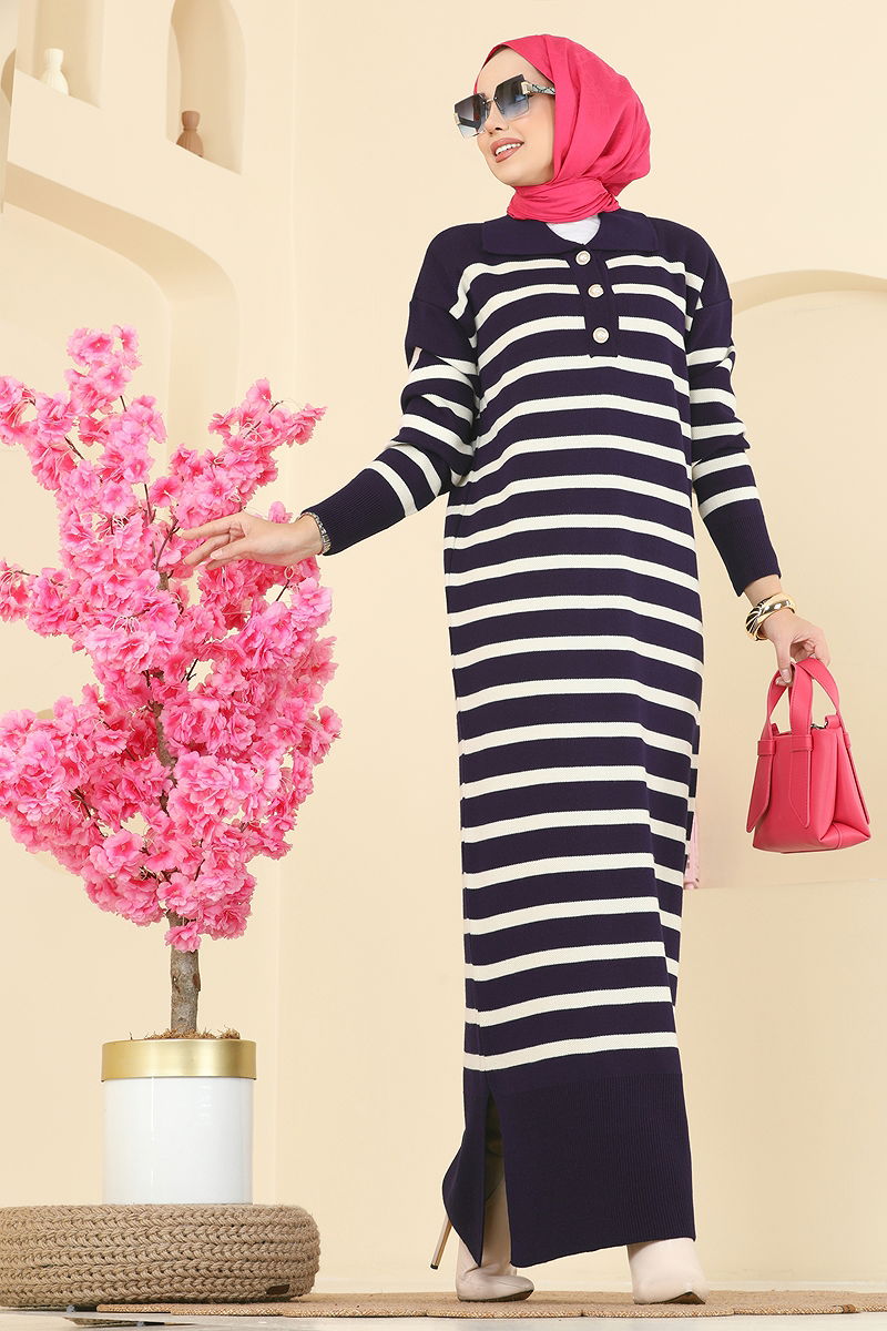 The Half-Buttoned Striped Knit Dress is a perfect choice for those seeking modest fashion. Suitable for autumn and winter, this dress promises long-lasting use with its gentle wash at 30 degrees feature. The shirt collar design and half-button front detail add elegance, while its lining-free structure ensures lightweight and comfortable wear.
