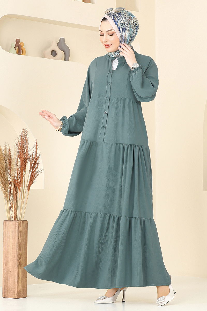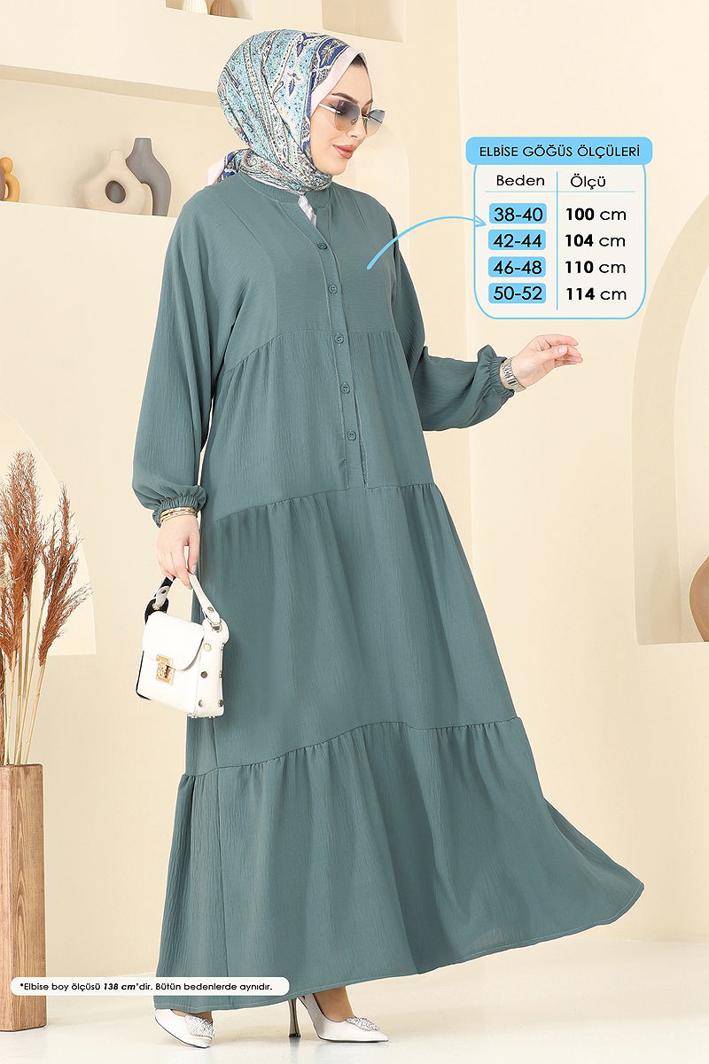 The Front-Buttoned Aerobin Dress offers a modern and stylish look. Made from aerobin fabric, this modest dress can be comfortably worn in all seasons. It features a V-neck design and a half-buttoned front for practical use. It can be washed delicately at 30 degrees. Its unlined structure provides a light and comfortable experience. The dress has elastic cuffs, and the model measurements are: Height: 167 cm, Chest: 90 cm, Waist: 70 cm, Hips: 100 cm, Weight: 59 kg.