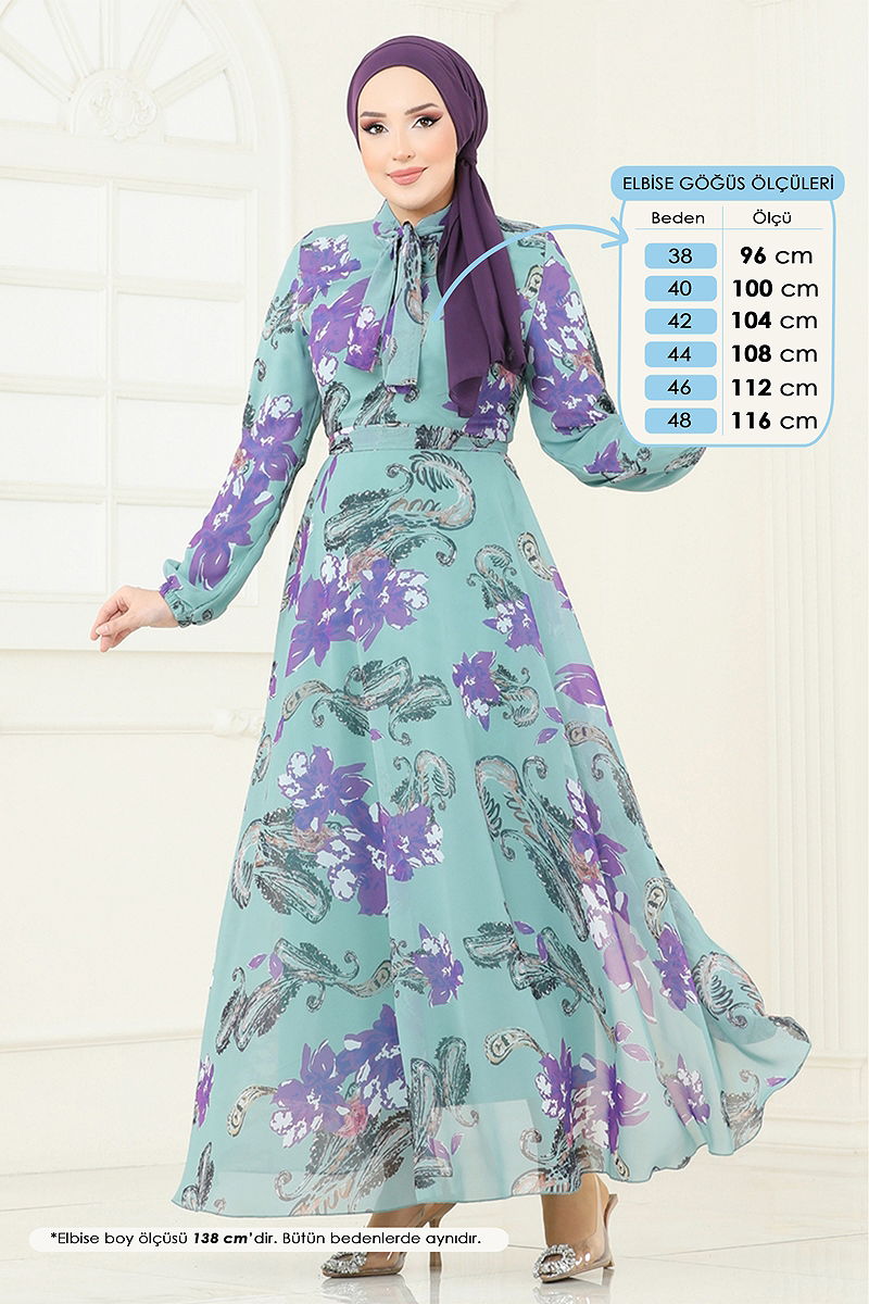 The Scarf Collar Chiffon Dress is a chic and modern modest wear option. Suitable for all seasons, it can be gently washed at 30 degrees. Made from chiffon, this lined dress features a back zipper for ease of wear. Its scarf collar adds a touch of elegance, and there is a functional button at the back. The belt is stitched at both ends, leaving the middle part open. The belt is optional and the cuffs are elasticated. The product displayed is a size 38.