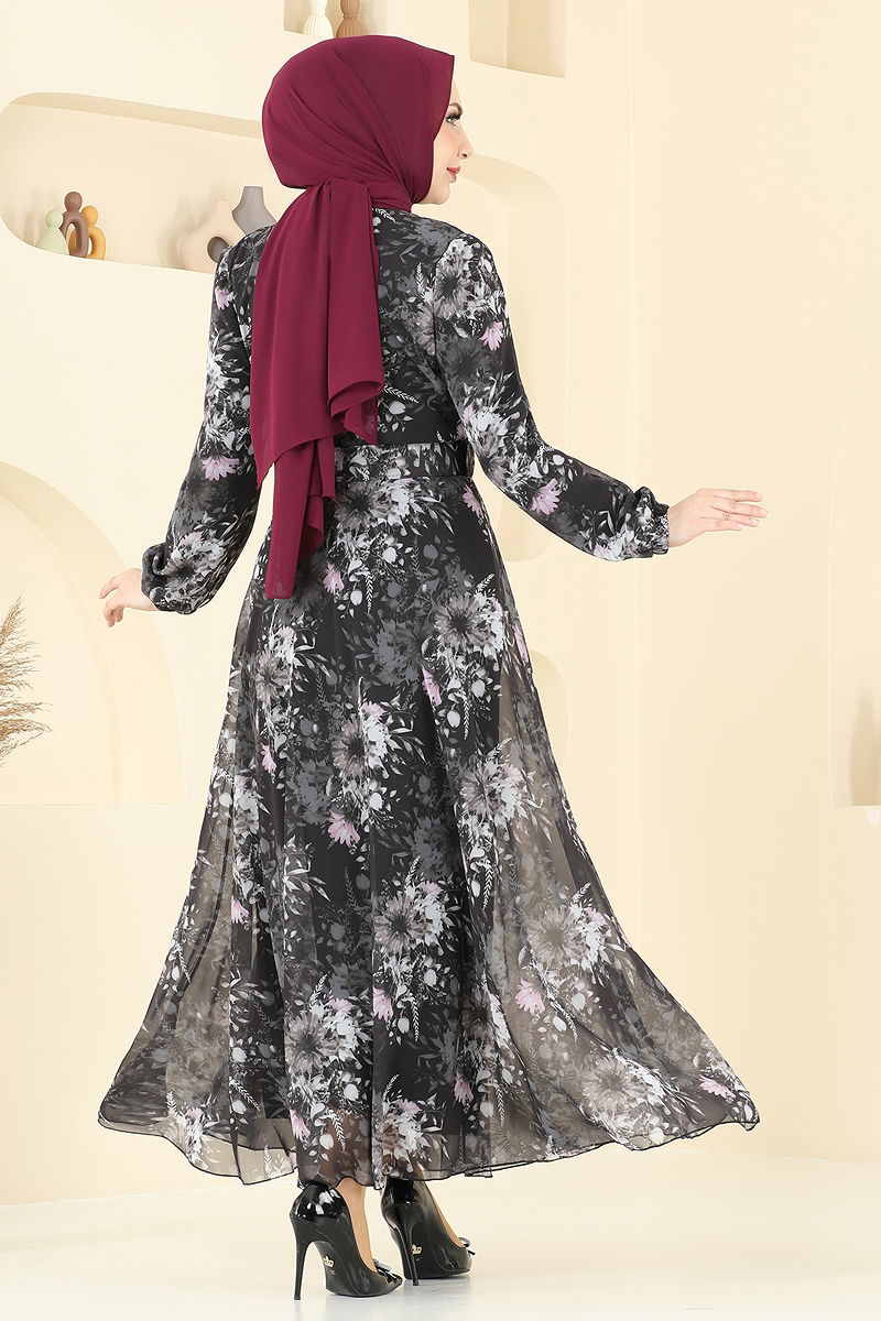 Patterned Belted Chiffon Dress is a hijab fashion item suitable for all seasons. Made from chiffon, it can be washed in a gentle cycle at 30 degrees. The dress features a crew neck, lining that adds sophistication, and elastic cuffs. It includes a specifically designed belt with fixed ends to maintain a smooth appearance, which can be worn or removed as desired. The back features an accessible button and the product displayed is size 38.