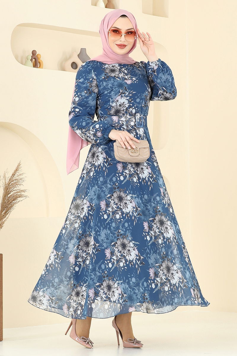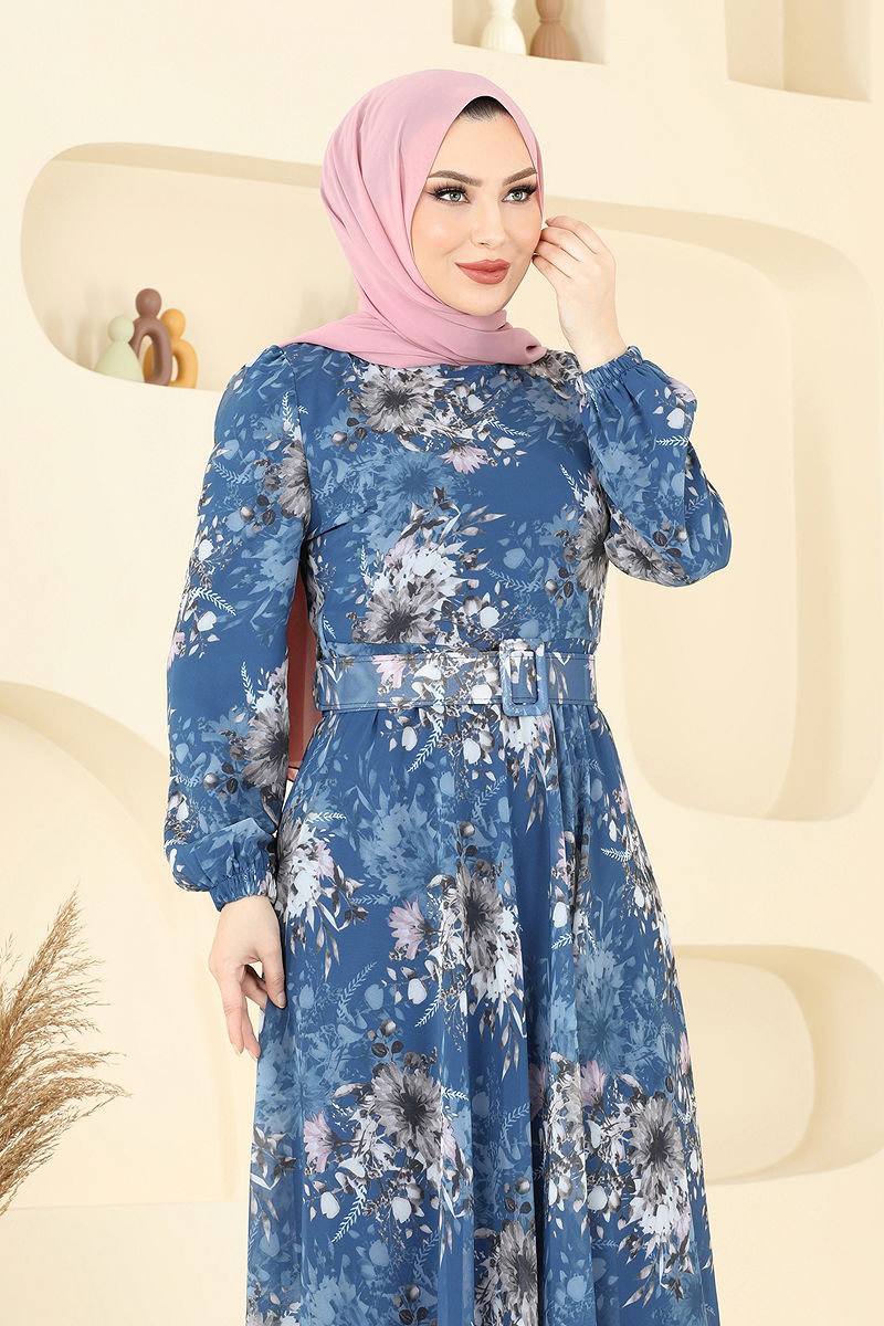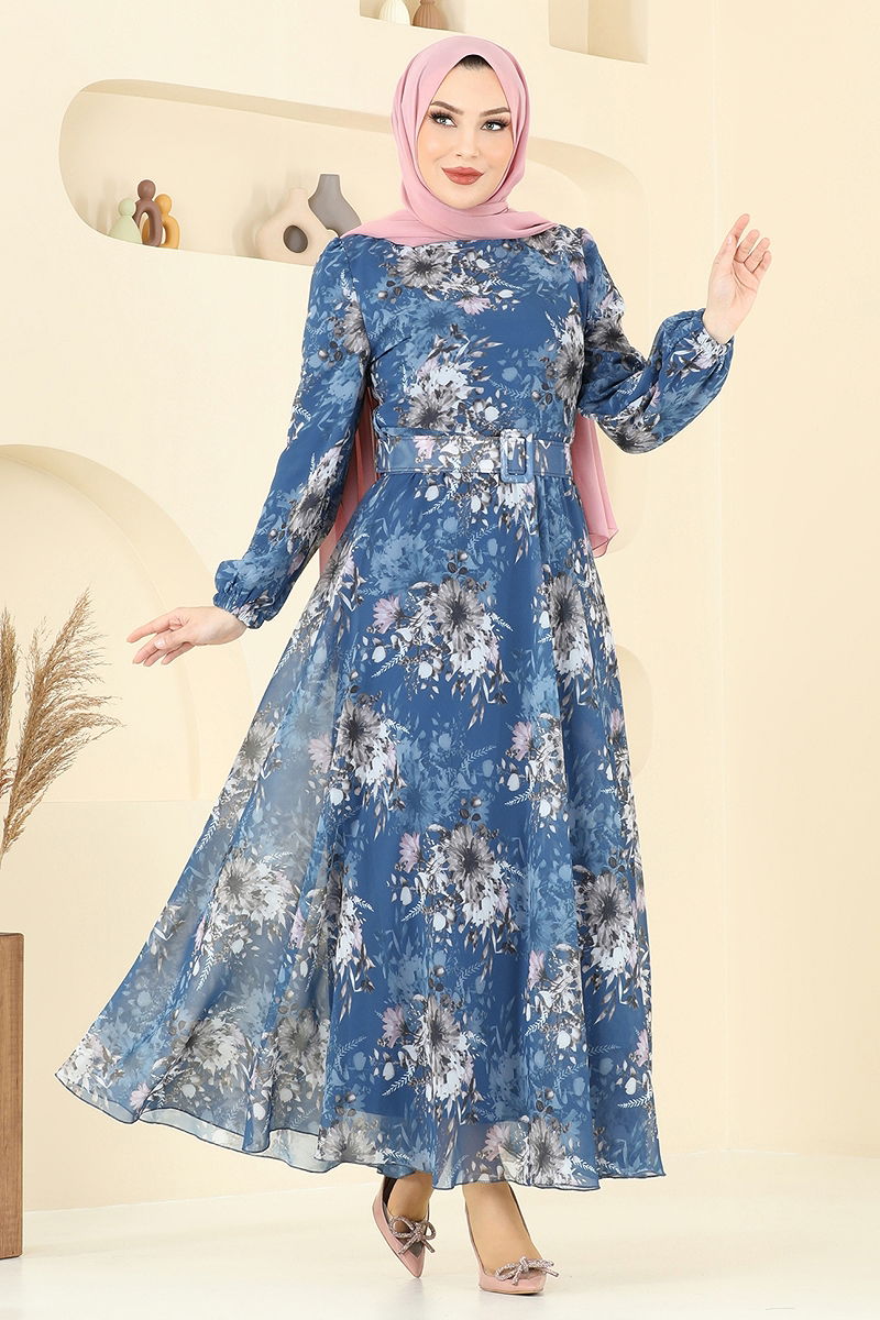 Patterned Belted Chiffon Dress is a hijab fashion item suitable for all seasons. Made from chiffon, it can be washed in a gentle cycle at 30 degrees. The dress features a crew neck, lining that adds sophistication, and elastic cuffs. It includes a specifically designed belt with fixed ends to maintain a smooth appearance, which can be worn or removed as desired. The back features an accessible button and the product displayed is size 38.