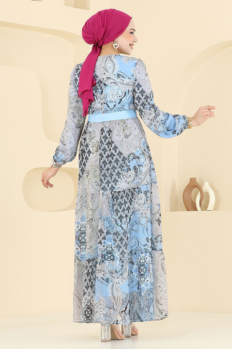 The Ethnic Pattern Chiffon Dress is a modest attire suitable for all seasons. Made from 100% chiffon, this dress can be washed at 30 degrees on a delicate cycle. It features a crew neck design and is fully lined for added elegance. The back is zippered, and the buttons are purely decorative. The belt detail is designed to prevent any waving, stitched at ends, with a middle part left seamless; it can be removed optionally. This dress also has elasticated cuffs, making it both comfortable and stylish.