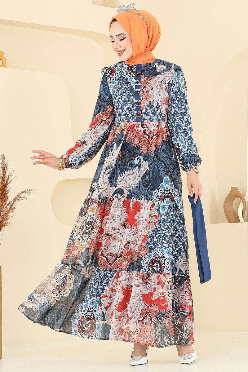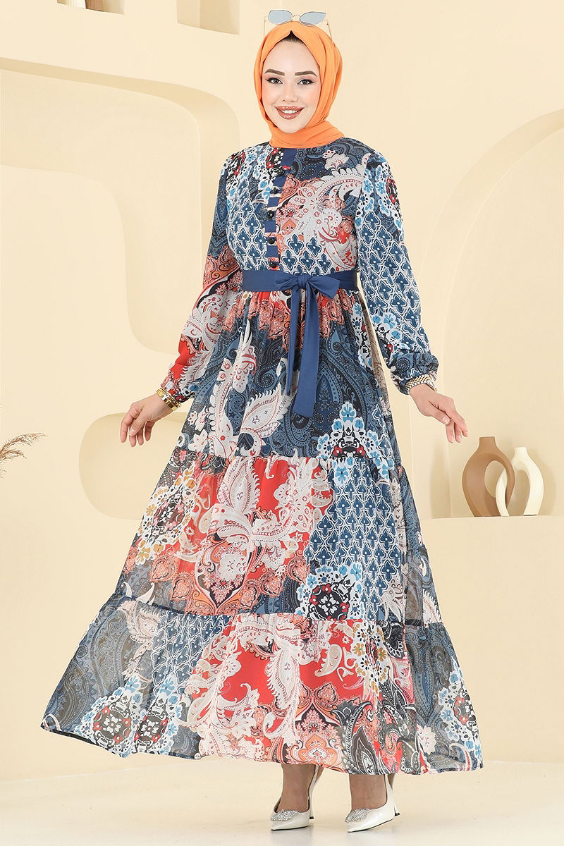 The Ethnic Pattern Chiffon Dress is a modest attire suitable for all seasons. Made from 100% chiffon, this dress can be washed at 30 degrees on a delicate cycle. It features a crew neck design and is fully lined for added elegance. The back is zippered, and the buttons are purely decorative. The belt detail is designed to prevent any waving, stitched at ends, with a middle part left seamless; it can be removed optionally. This dress also has elasticated cuffs, making it both comfortable and stylish.