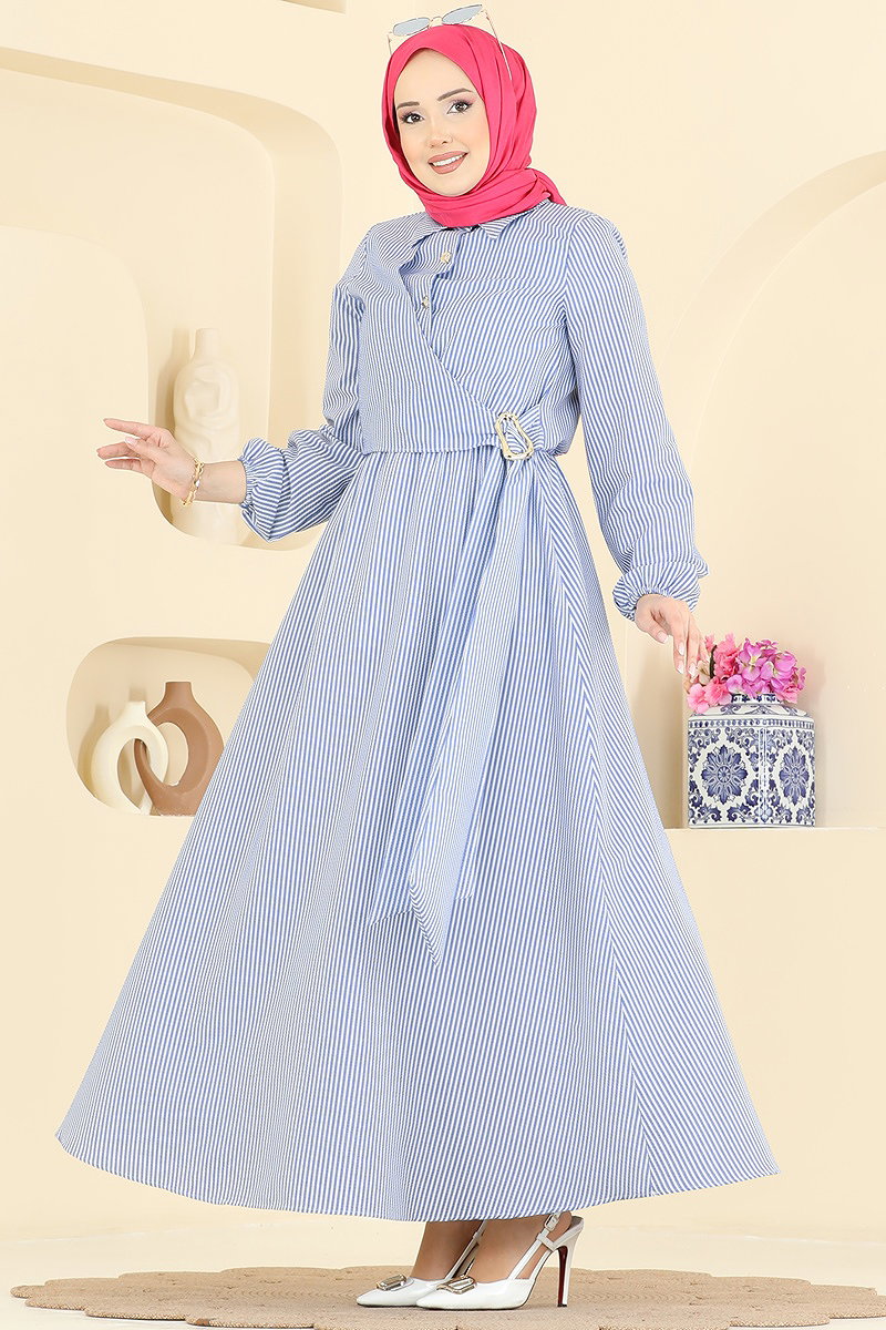 Featuring a modern and chic design, the Striped Clasp Detailed Dress will become an essential piece in your modest clothing collection. Suitable for all seasons, this dress can be washed at 30 degrees due to its delicate nature. Made from seersucker fabric, it features a shirt collar design and a half-button front for practical use. The dress is unlined and has elastic cuffs, which increase comfort while providing an eye-catching look with elegant details.