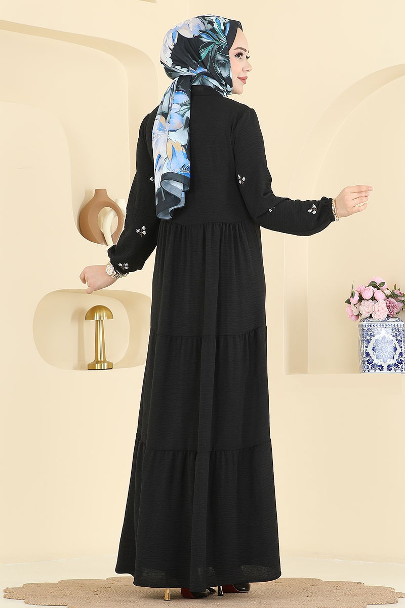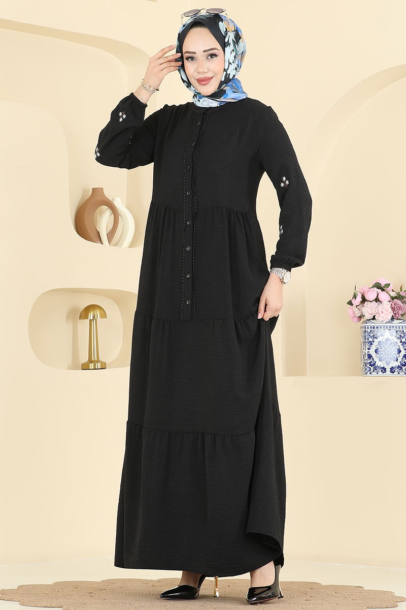 This elegant Embroidered Sleeve Aerobin Dress, with its hijab-friendly design, is comfortable to wear in all seasons. Washable at 30 degrees considering its delicate fabric, the dress offers both style and practicality. It's semi-mandarin collar and half-button front design add a modern touch, while the ruffled hem contributes a feminine flair. Adorned with intricate embroidery details, this chic piece enhances comfort with its elastic-cuffed sleeves. Its unlined structure ensures a light and comfortable fit. The product is modeled in a size 38.