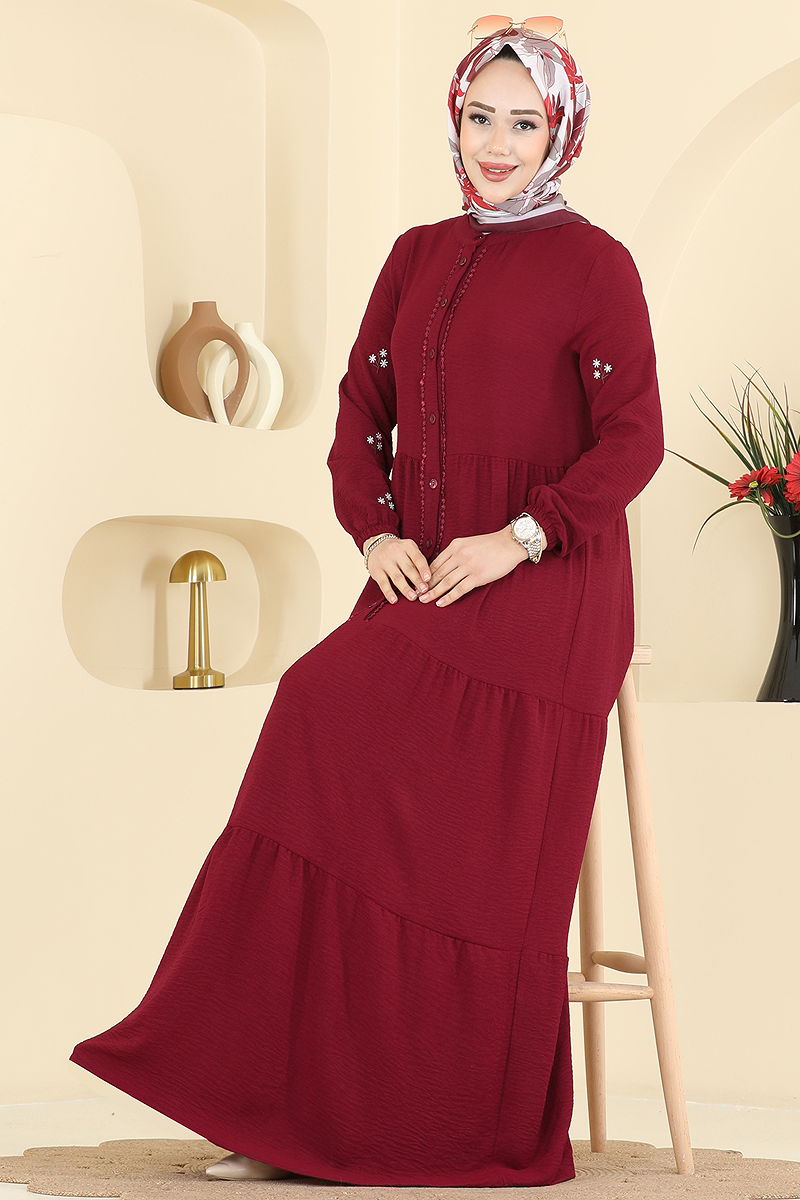 المنتج لديه ياقة نصف بيضوية. المنتج به أزرار نصف أمامي. المنتج به كشكشة في جزء التنورة. غير مبطنة. يتم خياطة تفاصيل التطريز. السوار مطاطي. قد يكون هناك اختلاف في الدرجة اللونية في المنتج بسبب التقاط الصور الفوتوغرافية.