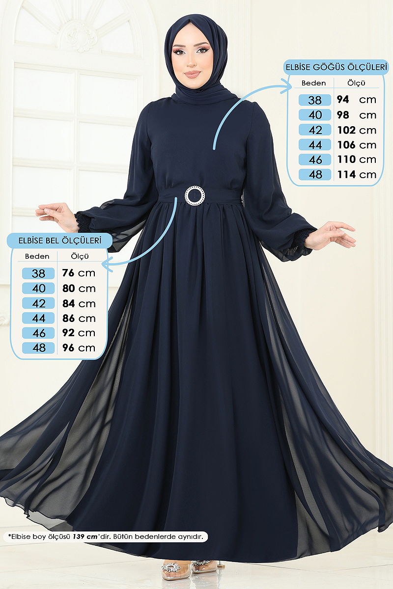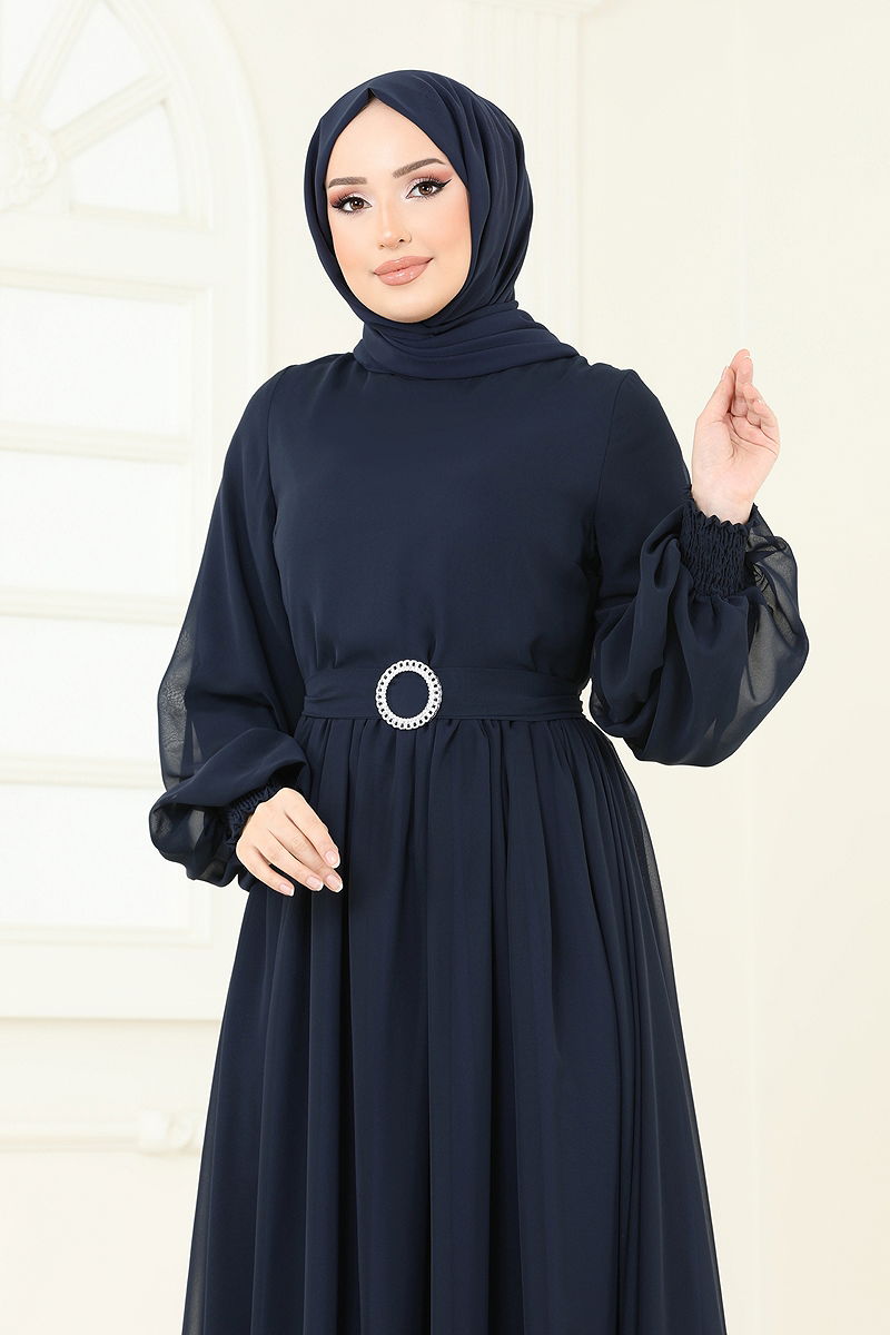 With its elegant and modern design, the Elastic Cuffed Chiffon Dress stands out as the perfect choice to maintain your style in any setting. This hijab dress can be comfortably worn in all four seasons and is notable for its washability at 30 degrees under delicate conditions. Made from chiffon fabric, it features a crew neck and is lined. The zipper at the back makes it easy to wear and remove. The belt detail adds a touch of elegance to your style, while the elastic cuffs ensure comfort.