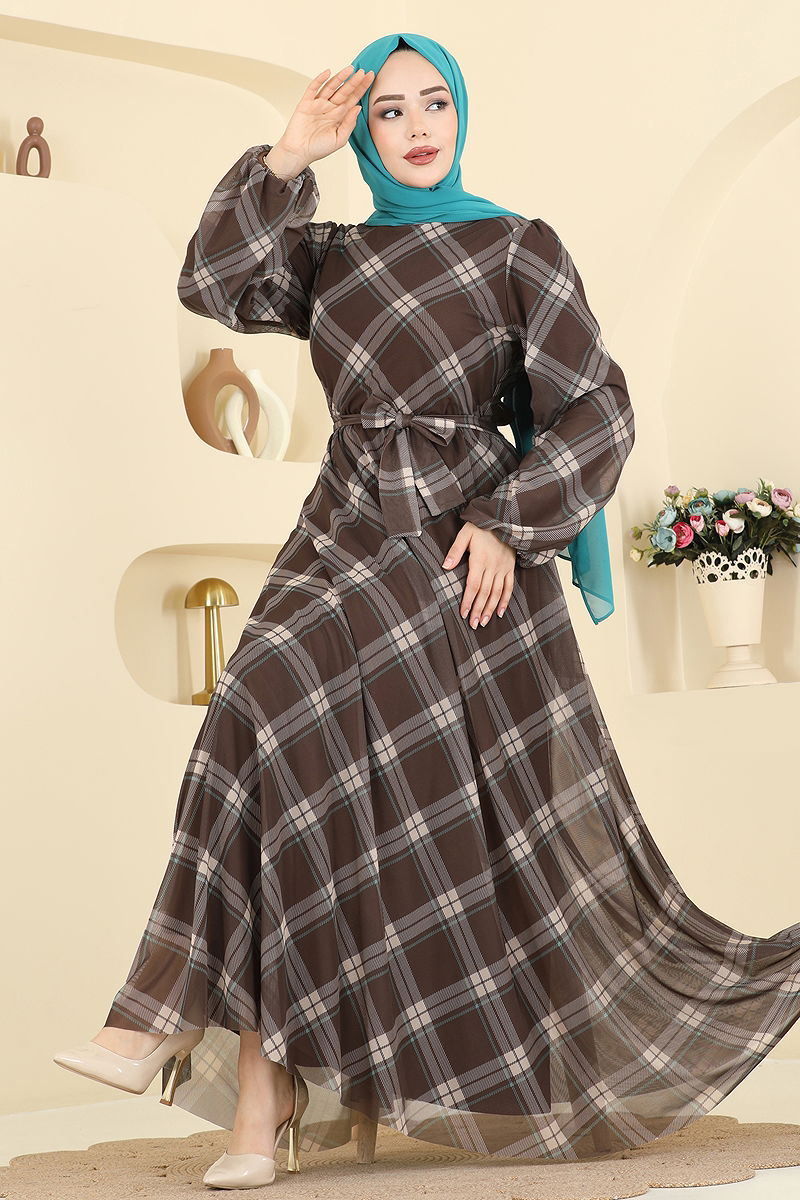 The Plaid Tulle Dress is designed specifically for individuals who adopt the modest clothing style. Usable across all seasons, this dress can be washed at 30 degrees on a gentle cycle. Made from tulle fabric, it features a crew neckline and is lined. The sample shown is size 38. It includes an elastic waistband and a functional button at the back. Ideal for various social activities and daily wear.