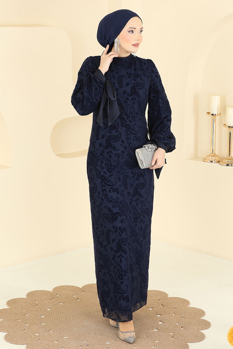The Printed Dress with Tie-Up Cuffs is an elegant and chic option for modest fashion. This dress, suitable for all seasons, is made of flog fabric and is lined. It offers practical use with a zipper at the back and its tie-up cuffs make it stand out. This model should be dry cleaned only and ironed inside out. The product shown on the model is size 38.