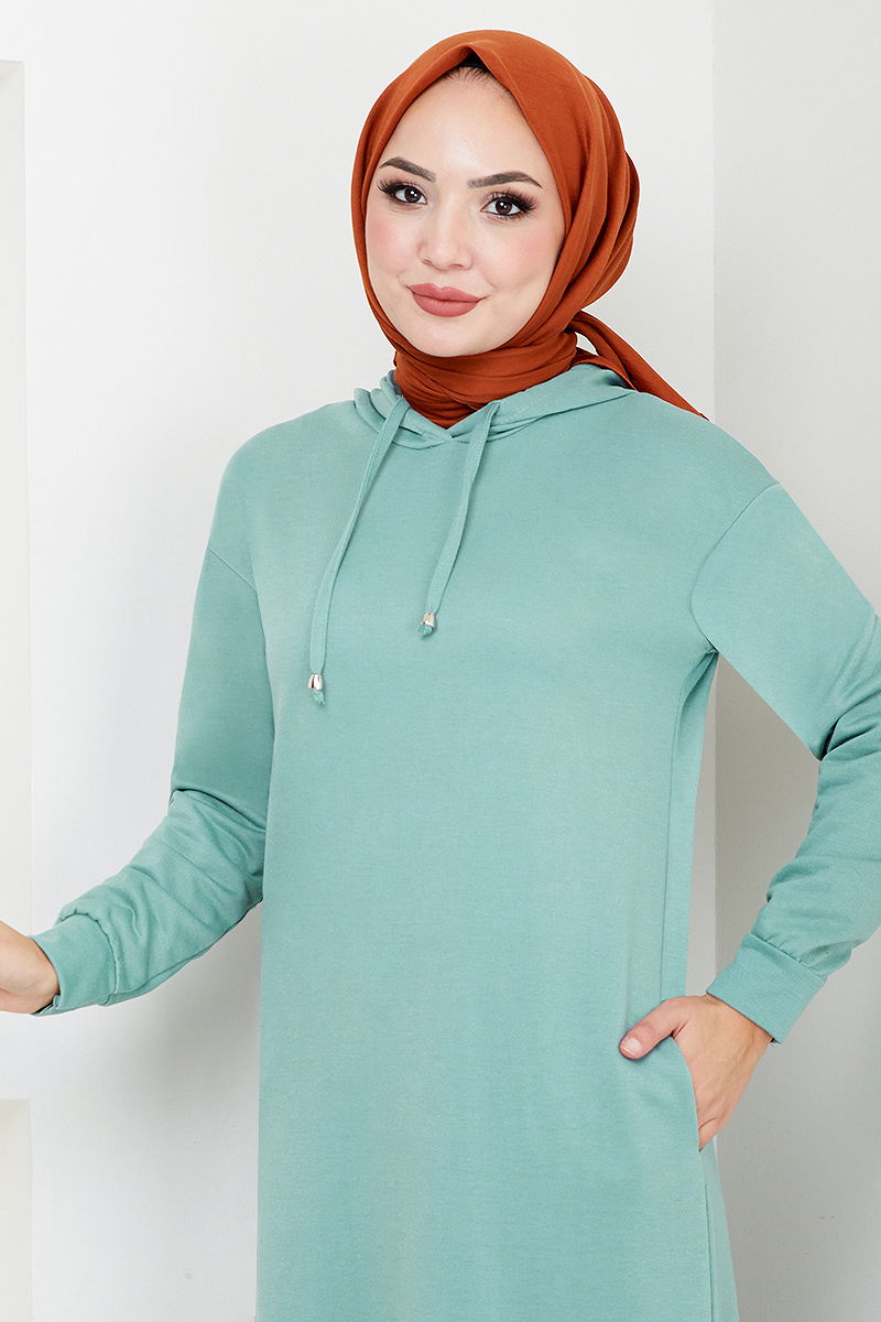 Hooded Sports Dress model is a modest fashion item. It can be used throughout the Four Season season. It is recommended to wash at 30 degrees without squeezing. It is made of first-class Two Thread fabric. The product has a hooded collar design and is unlined. (The product on the model is size 38.) There is a pocket.