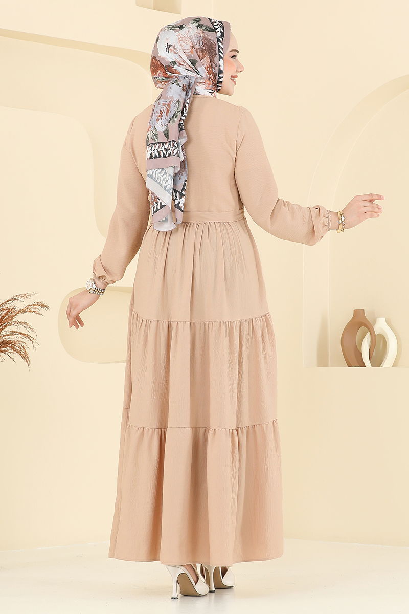 The Layered Skirt Hijab Dress is a four-season, modest attire. It can be washed gently at 30 degrees and is made from breathable cotton aerobin fabric. Featuring a crew neck and elastic cuffs, it offers comfort. The product is unlined and displayed in a size Medium. It is a pullover dress that comes with a belt having stitched ends to prevent flapping, which can be optionally left unused.