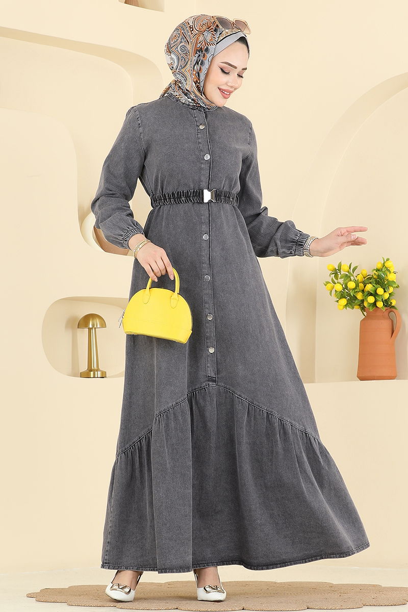 Product Name: Lock Belt Denim Dress. This stylish dress can be comfortably worn in all seasons. Washable at 30 degrees on a delicate cycle, this modest dress is made from high-quality denim. Featuring a half stand collar and front button fastening, it offers a contemporary look. Its lining-free design ensures it is lightweight and comfortable. The hidden pocket provides practical use, while the belt is both a stylish detail and optional. With elastic cuffs, this dress is perfect for maintaining your elegance in any setting.