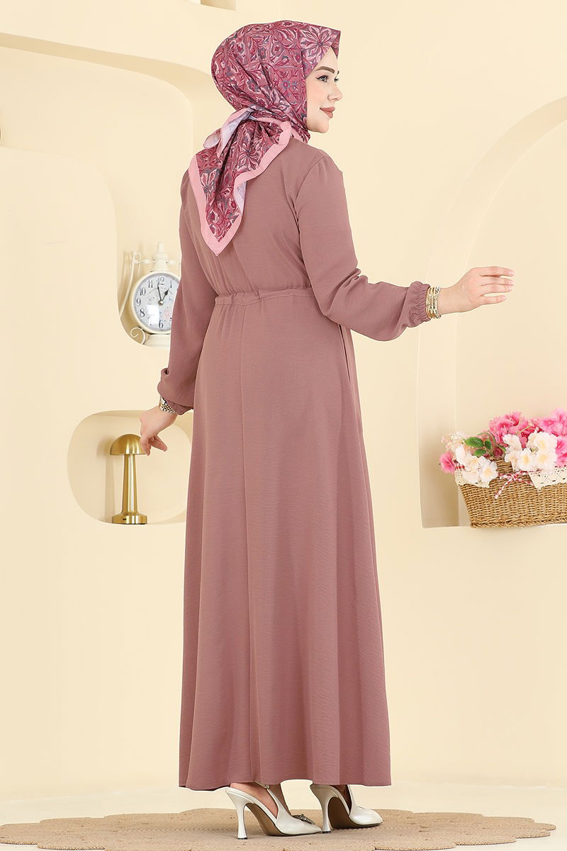 This stylish Belted Long Dress is a modest garment ideal for all-season wear. Made from breathable aerobin fabric, it offers comfort while the half stand collar and half-button front design provide an elegant look. The waist can be adjusted with ties for a custom fit, and it features practical pockets as well as elasticated cuffs for enhanced comfort. It is washable at 30 degrees on a delicate cycle.