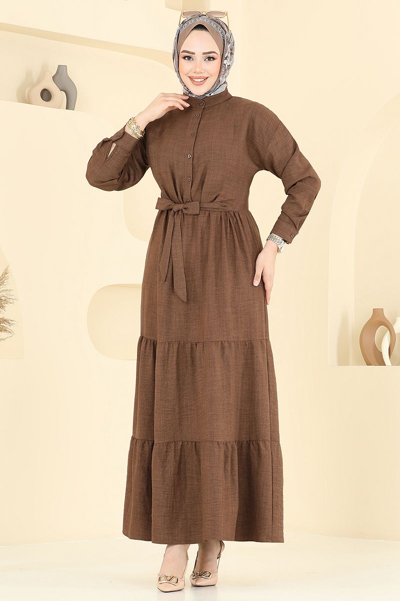 Crafted from Sofia linen fabric, this tiered dress is suitable for hijab wear and can be used across all seasons. It features a mandarin collar and half-button front, offering a modern design. The dress is unlined for a light and comfortable wear, and the stitched belt detail enhances its elegance. It is recommended to be washed gently at 30 degrees. The displayed model wears a size 38, providing an ideal fit.