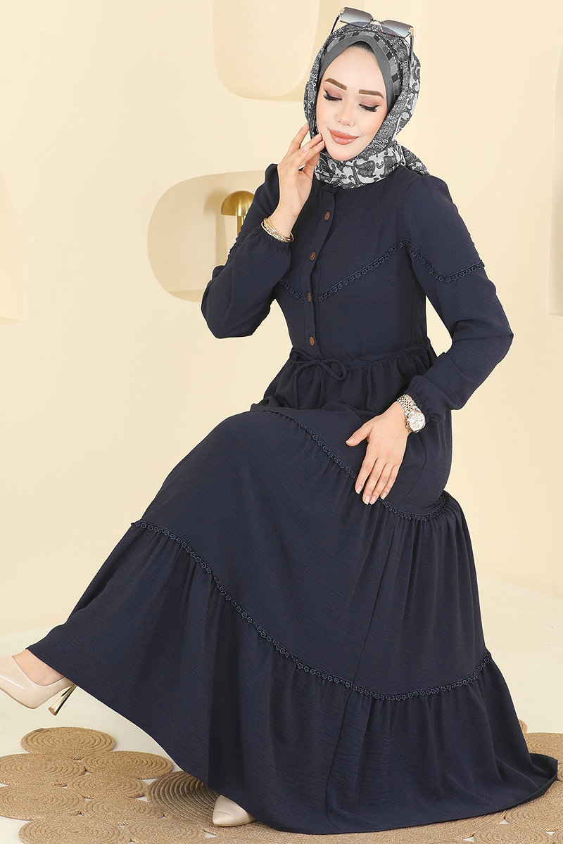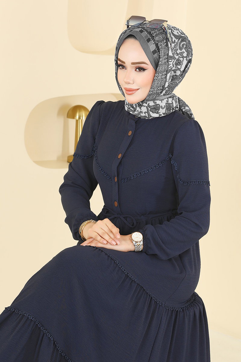 With its unique design and comfort, the Pattern Detailed Aerobin Dress brings a fresh breath to modest fashion, suitable for all seasons. Washable at 30 degrees on a gentle cycle, this dress offers both style and convenience with its half mandarin collar and half-button front details. Featuring a tie-waist and elasticated cuffs, this model combines the lightness and breathability of aerobin fabric to ensure comfort all day long. Ideal for those seeking a lightweight and comfortable option, this unlined dress is presented in a size 38 model, making it suitable for every body type and style.