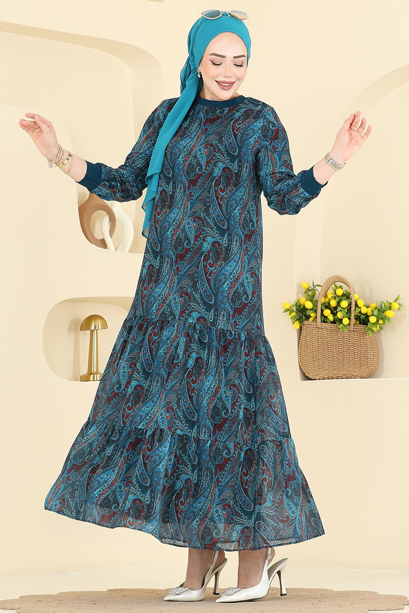 Product Name: Printed Chiffon Dress. This elegant modest dress is designed to be comfortably worn in all seasons. The dress, which should only be dry cleaned, is made of chiffon fabric, features a crew neck and has a flexible lining. It stands out with its print details. The product on the model is size 38.