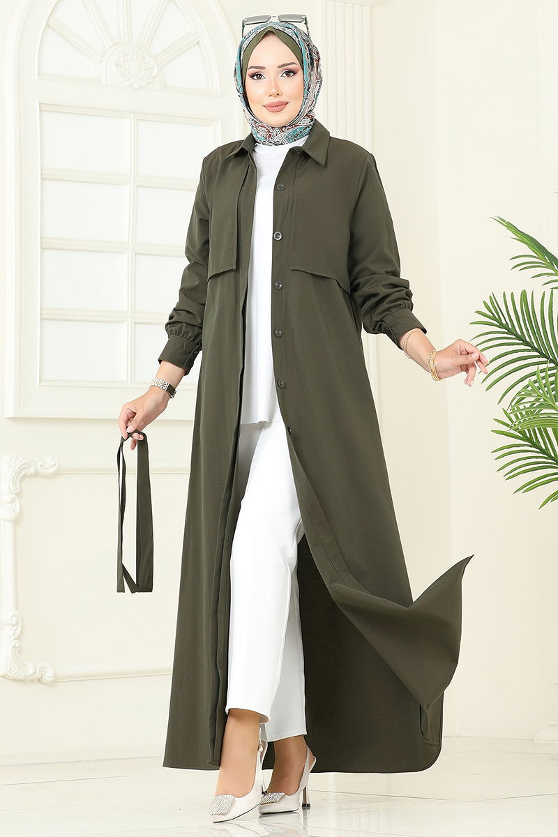 المنتج لديه ياقة القميص. المنتج به أزرار جيزلي. غير مبطنة. الحزام متضمن، ،يمكن استخدامها حسب الرغبة أزرار الكفة نشطة. قد يكون هناك اختلاف في الدرجة اللونية في المنتج بسبب التقاط الصور الفوتوغرافية.