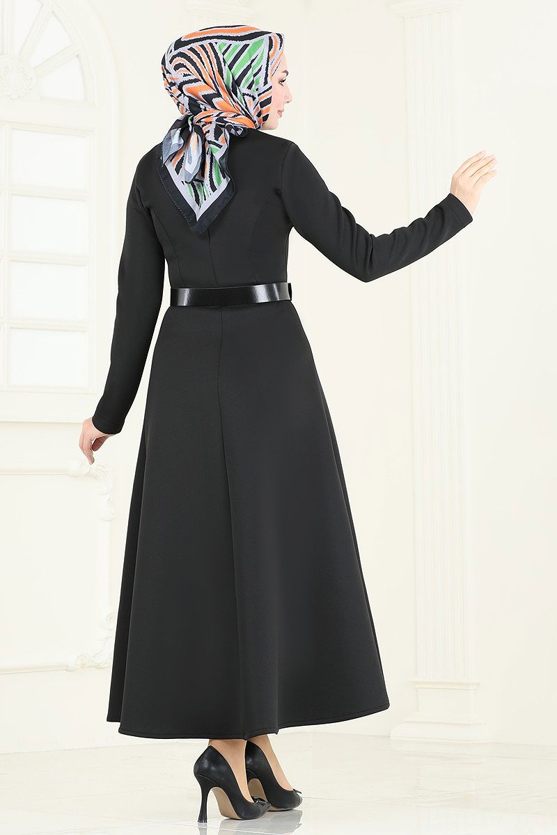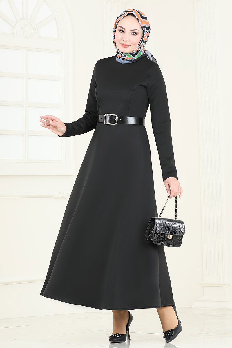 Belt Detail Dress The model is a hijab dress product. It can be used in Four Seasons season. It can be washed without squeezing at 30 DEGREES. (GENTLE WASH)It is made of scuba fabric.The product has a Bicycle collar. It is unlined.The product has a zip from the back. (The product on the model is size 38.)The ends of the belt are sewn to prevent it from flapping, and the middle part is left empty (seamless).The belt is included in the product and can be optionally used.