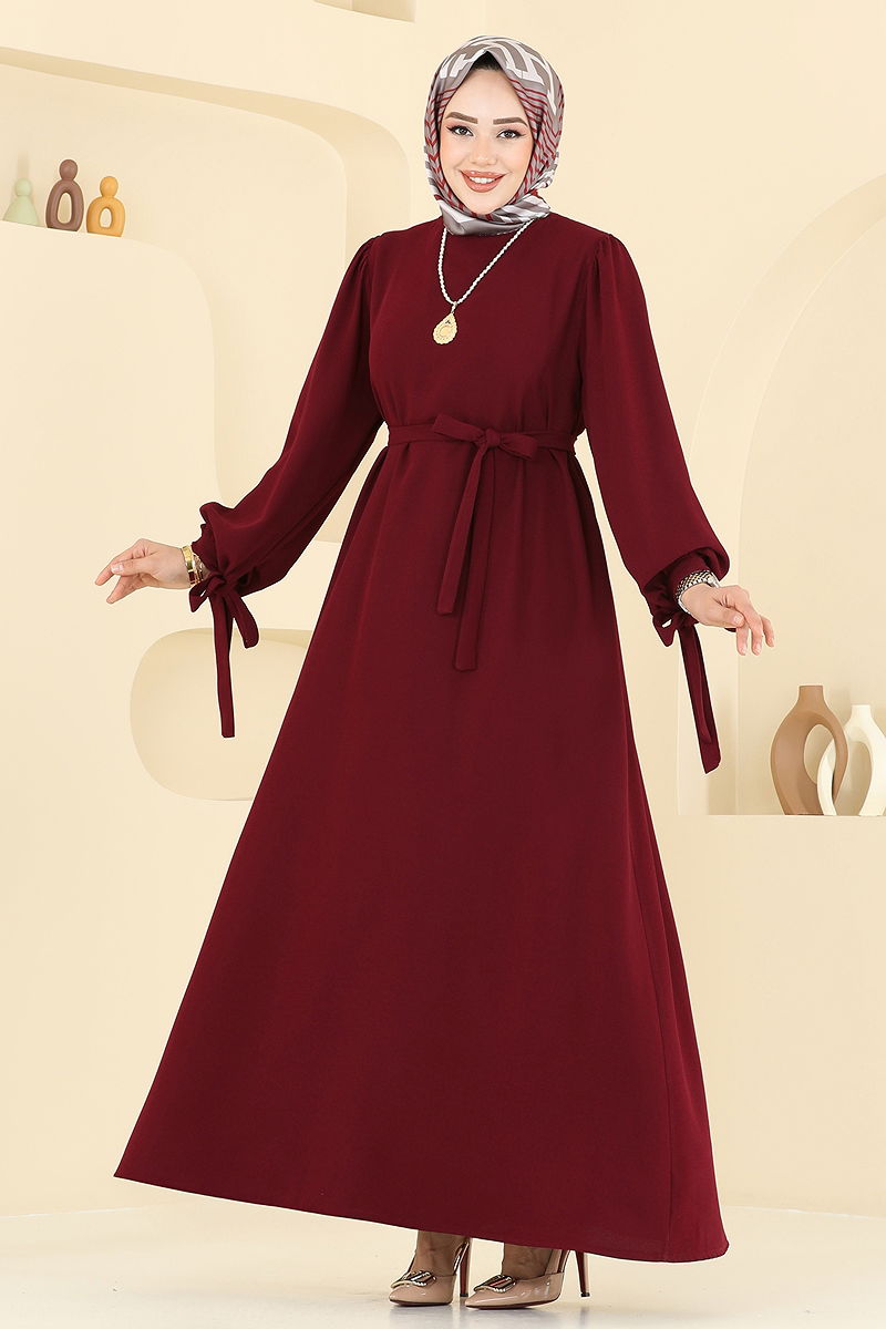Discover the unique Lace-up Cuff Hijab Dress, designed for year-round comfort. This dress can be washed at 30 degrees with gentle care and is made from durable crepe fabric. It features a crew neck and a zipper at the back, adding a modern touch. The unlined design ensures a light and comfortable wear. The included belt, which can be used optionally, completes your elegant look. With its lace-up cuffs, this dress offers a sophisticated appearance that fits every size and style.