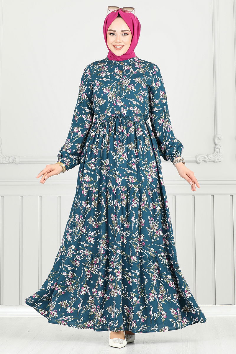 The Floral Pattern Hijab Dress is an innovative and stylish choice that can be comfortably worn in all seasons. Featuring a bike collar detail, this dress offers practicality with its front half buttons. The soft texture of the viscose fabric ensures comfort throughout the day, while hand washing provides durability. With a tie waist and elastic cuffs, this model is both chic and functional.