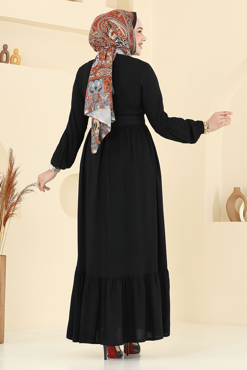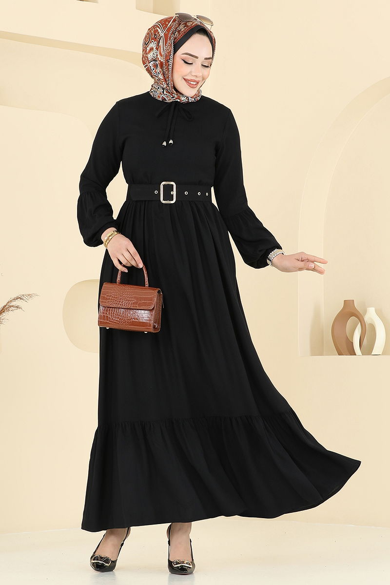 The Coated Belted Dress is a stylish modest wear product made from viscose fabric suitable for all seasons. It features a sleek design with a bicycle neckline and is unlined. Hand washing is recommended. The waist of the dress is sewn, and it is beautifully accented with a belt detail. The belt is designed with sewn ends to prevent waving and can be optionally removed. The cuffs are elasticated, and the product displayed is a size 38.