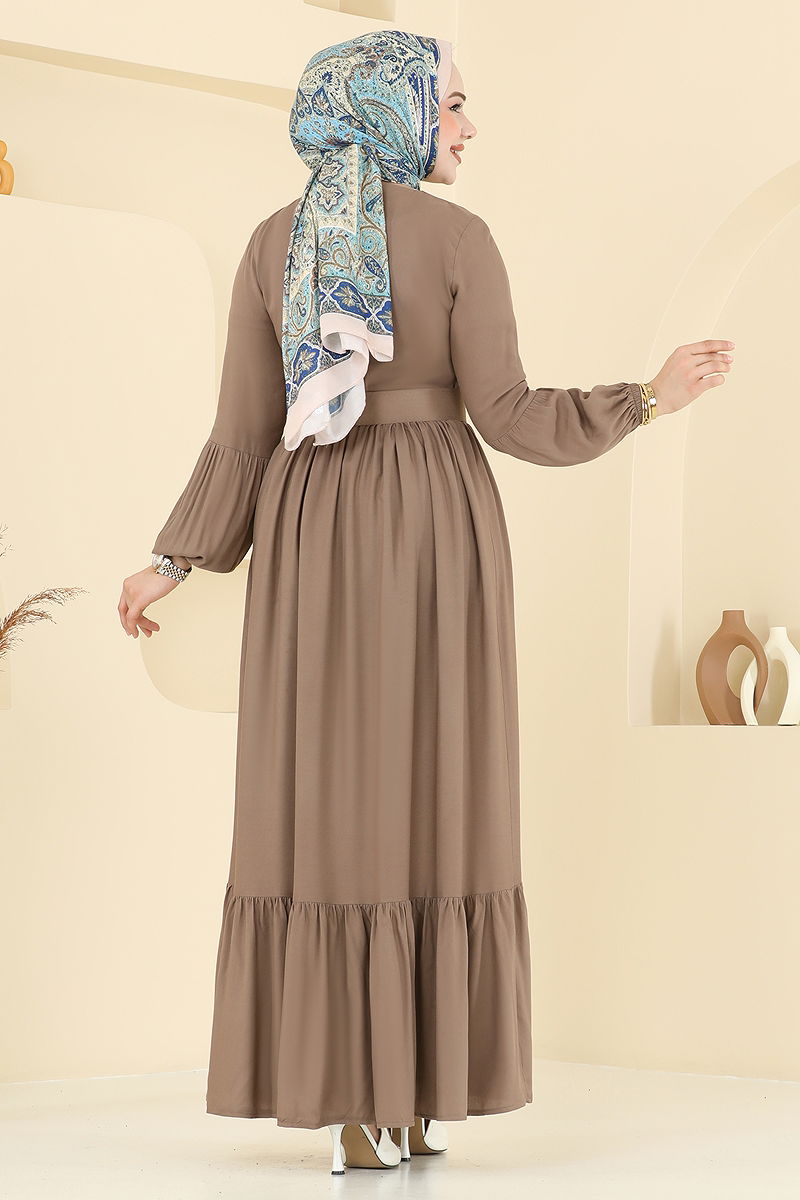 The Coated Belted Dress is a stylish modest wear product made from viscose fabric suitable for all seasons. It features a sleek design with a bicycle neckline and is unlined. Hand washing is recommended. The waist of the dress is sewn, and it is beautifully accented with a belt detail. The belt is designed with sewn ends to prevent waving and can be optionally removed. The cuffs are elasticated, and the product displayed is a size 38.