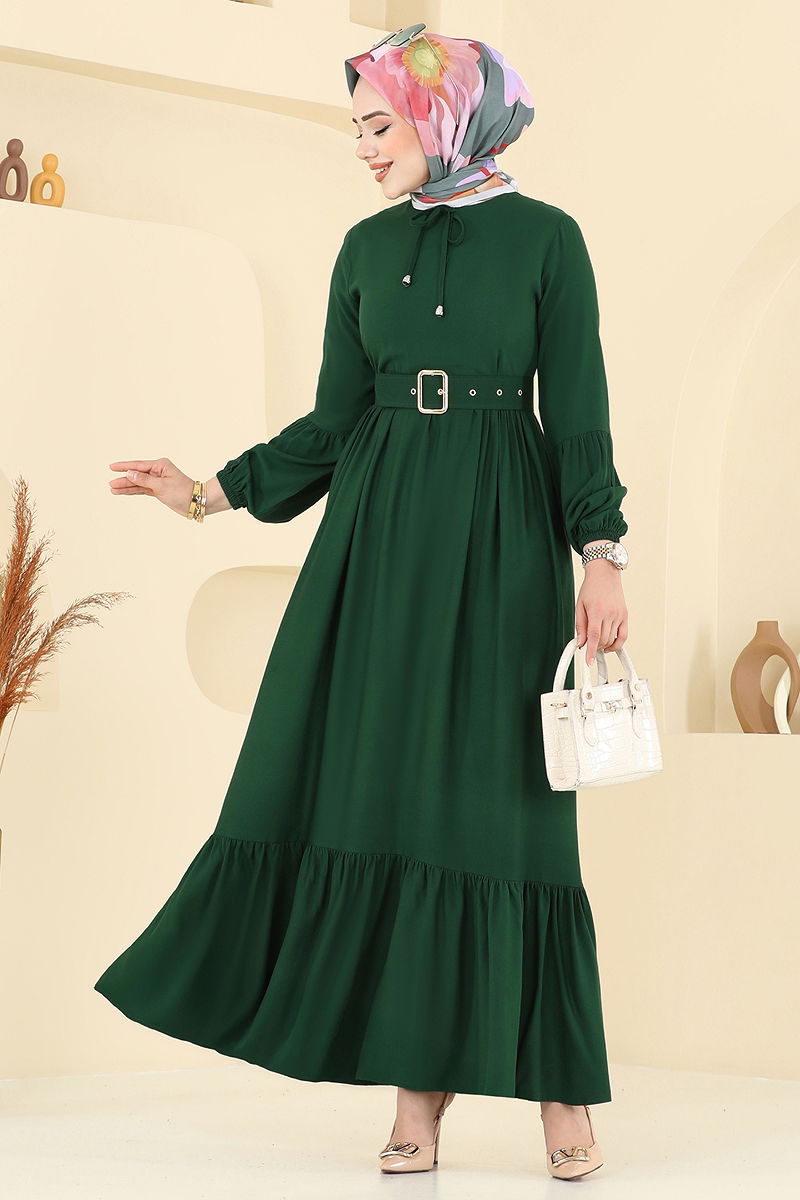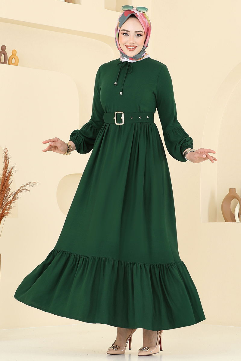 The Coated Belted Dress is a stylish modest wear product made from viscose fabric suitable for all seasons. It features a sleek design with a bicycle neckline and is unlined. Hand washing is recommended. The waist of the dress is sewn, and it is beautifully accented with a belt detail. The belt is designed with sewn ends to prevent waving and can be optionally removed. The cuffs are elasticated, and the product displayed is a size 38.