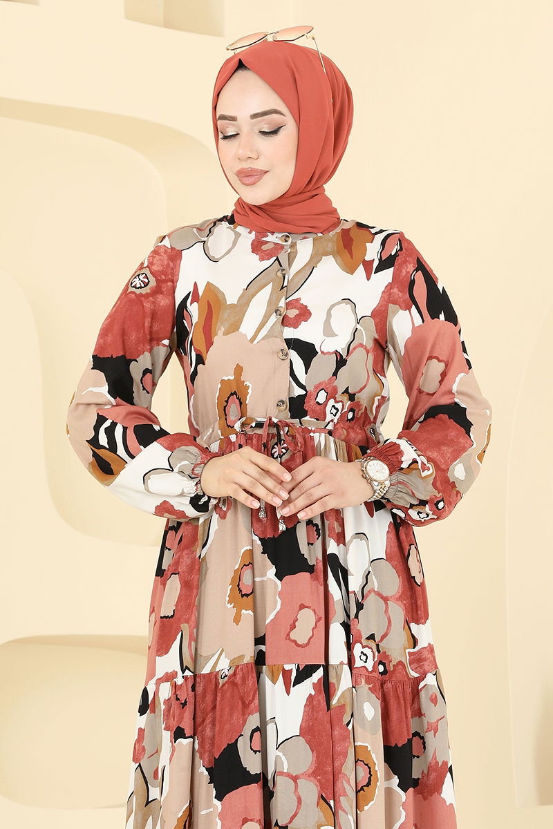 This elegant Floral Patterned Viscose Dress is perfect for all-season wear. Made from viscose fabric, it should be hand washed. Featuring a semi-mandarin collar and a half-button front design, it offers a modern and chic look. The unlined dress with a tie-around waist and elasticated cuffs provides comfortable wear. Ideal for maintaining your elegance in any setting, this dress is a modest wear version. The product displayed is size 38, but it is available in various sizes.