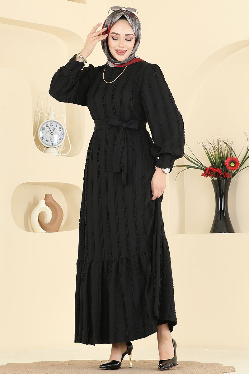 Highlighted by its details, the Crew Neck Detailed Dress is an ideal choice for modest apparel. Suitable for all seasons, it features a crew neck and buttoned back design, offering comfort with its unlined structure. This dress can be washed delicately at 30 degrees and comes with a belt detail that adds a stylish touch. The belt is included with the design and can be optionally removed. The product is presented in a size 38 sample.