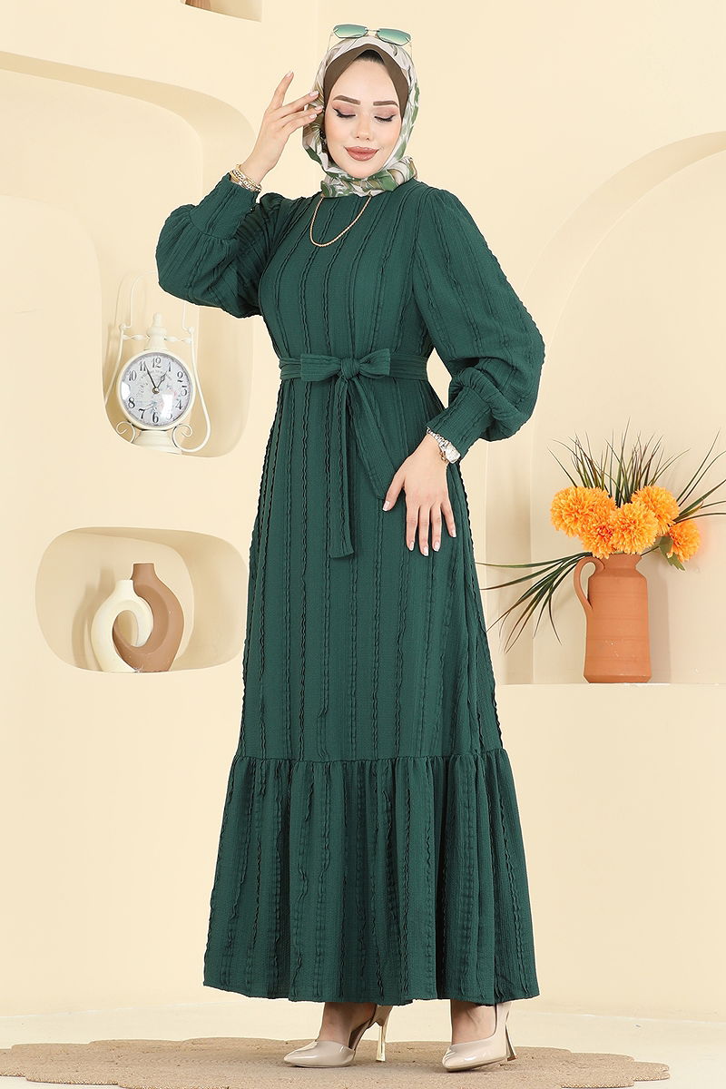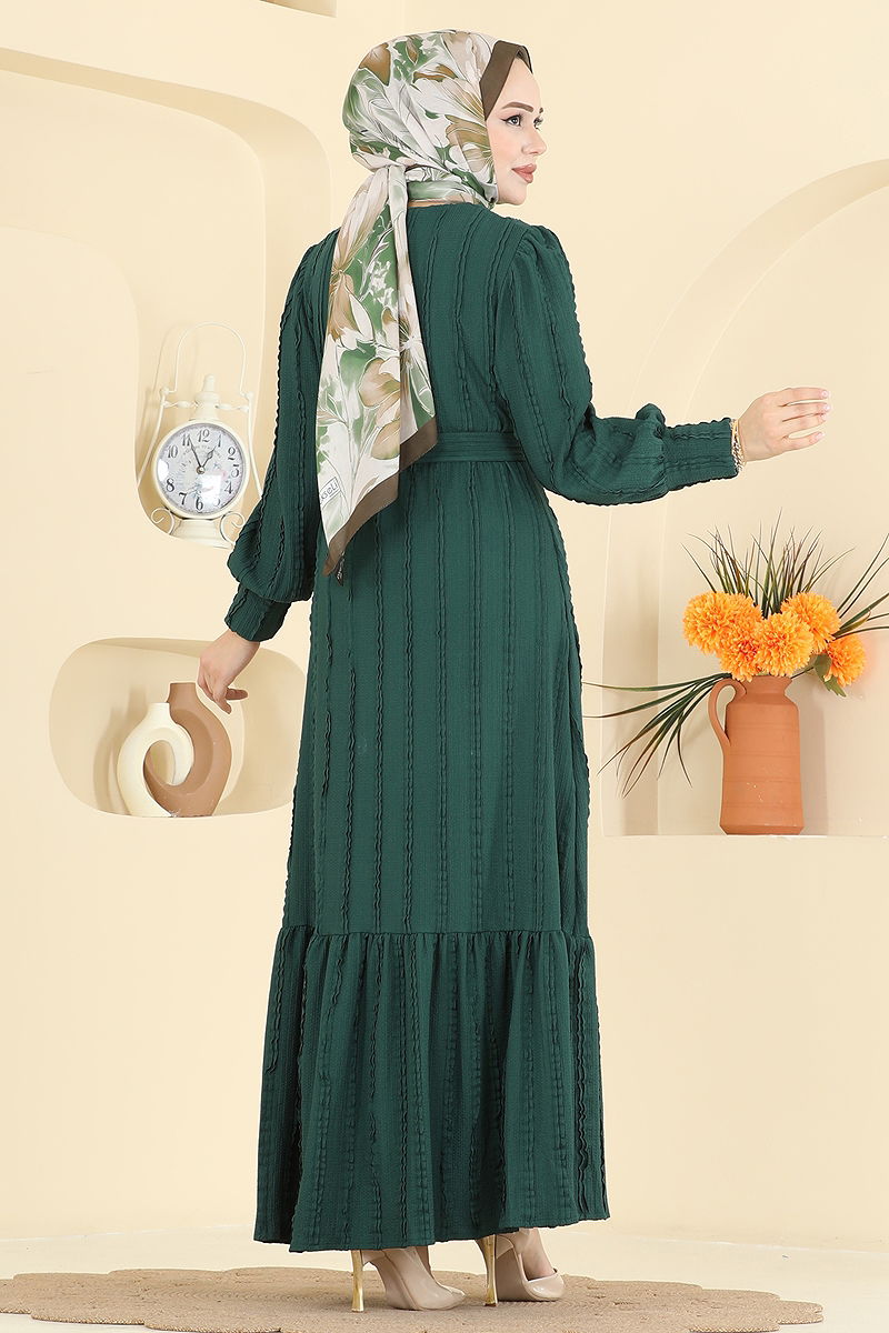 Highlighted by its details, the Crew Neck Detailed Dress is an ideal choice for modest apparel. Suitable for all seasons, it features a crew neck and buttoned back design, offering comfort with its unlined structure. This dress can be washed delicately at 30 degrees and comes with a belt detail that adds a stylish touch. The belt is included with the design and can be optionally removed. The product is presented in a size 38 sample.
