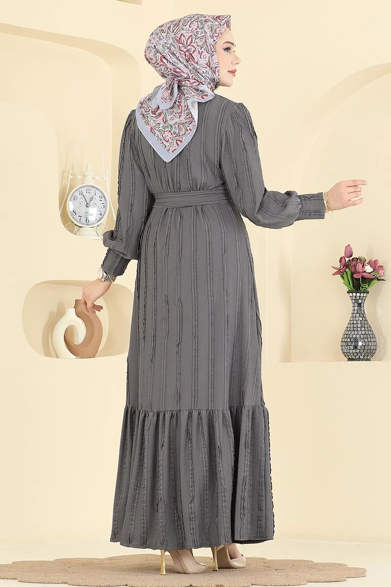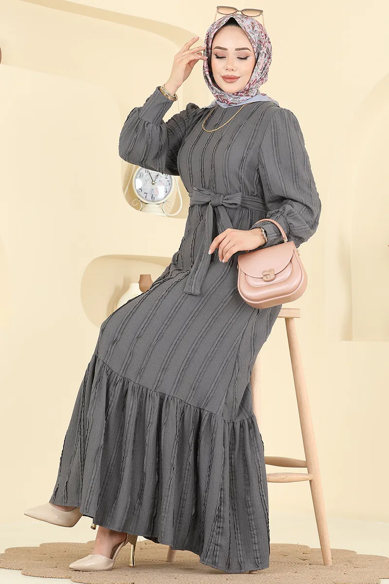 Highlighted by its details, the Crew Neck Detailed Dress is an ideal choice for modest apparel. Suitable for all seasons, it features a crew neck and buttoned back design, offering comfort with its unlined structure. This dress can be washed delicately at 30 degrees and comes with a belt detail that adds a stylish touch. The belt is included with the design and can be optionally removed. The product is presented in a size 38 sample.