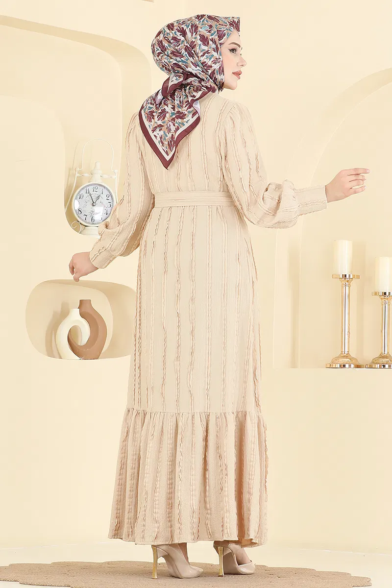 Highlighted by its details, the Crew Neck Detailed Dress is an ideal choice for modest apparel. Suitable for all seasons, it features a crew neck and buttoned back design, offering comfort with its unlined structure. This dress can be washed delicately at 30 degrees and comes with a belt detail that adds a stylish touch. The belt is included with the design and can be optionally removed. The product is presented in a size 38 sample.