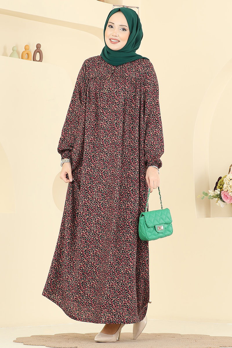 This stylish and modern floral patterned viscose dress combines elegance and comfort in modest wear. Suitable for all seasons, this dress can be washed at 30 degrees thanks to its delicate fabric structure. It offers practical use with its crew neck and half-button front. With active buttons and elastic cuffs, it is both fashionable and functional. The model shown is size 42, but it is available in different sizes.