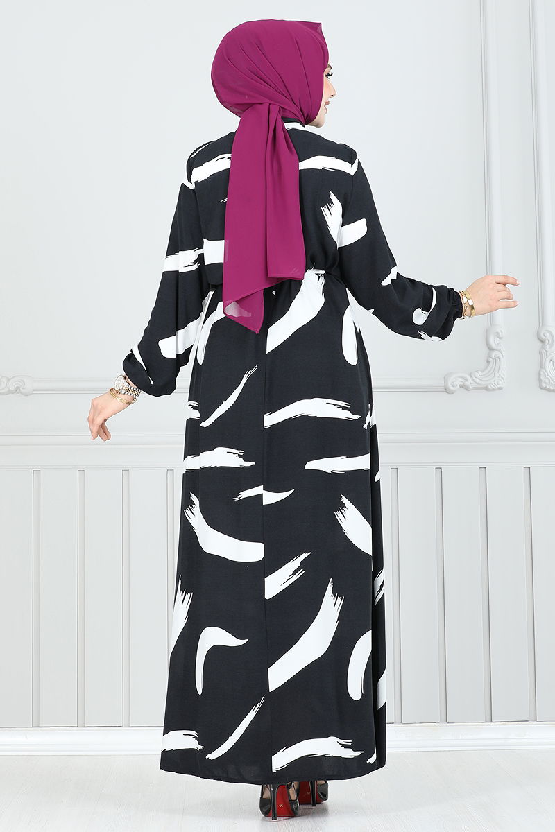 The Brush Pattern Viscose Dress is a stylish choice for modest wear. Suitable for all seasons, this dress is made from viscose fabric and requires hand washing. It features a semi-mandarin collar and a zipper at the back, providing a contemporary look. The unlined design ensures lightness and comfort. The included belt is stitched at both ends with an unstitched middle, and its use is optional. With elastic cuffs, this dress is perfect for both everyday wear and special occasions.