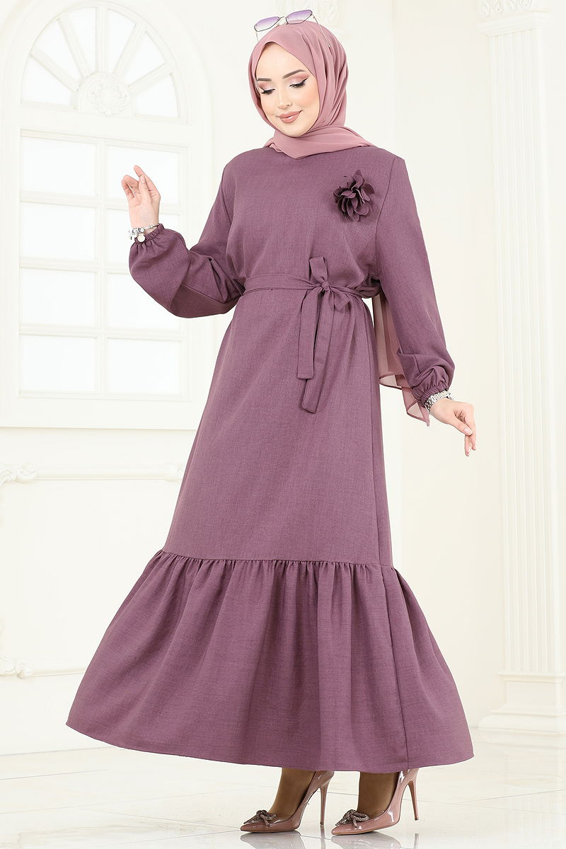 Crafted from Sofia Linen, the Rose Detail Linen Dress is specifically designed for modest wear. Suitable for all seasons, this dress can be cleaned with a gentle 30-degree wash. It features a mandarin collar and a zipper at the back, offering a chic and contemporary look. The unlined dress comes with a belt and brooch, both of which can be optionally removed. The belt is designed with stitched ends to prevent waviness, enhancing the overall design.